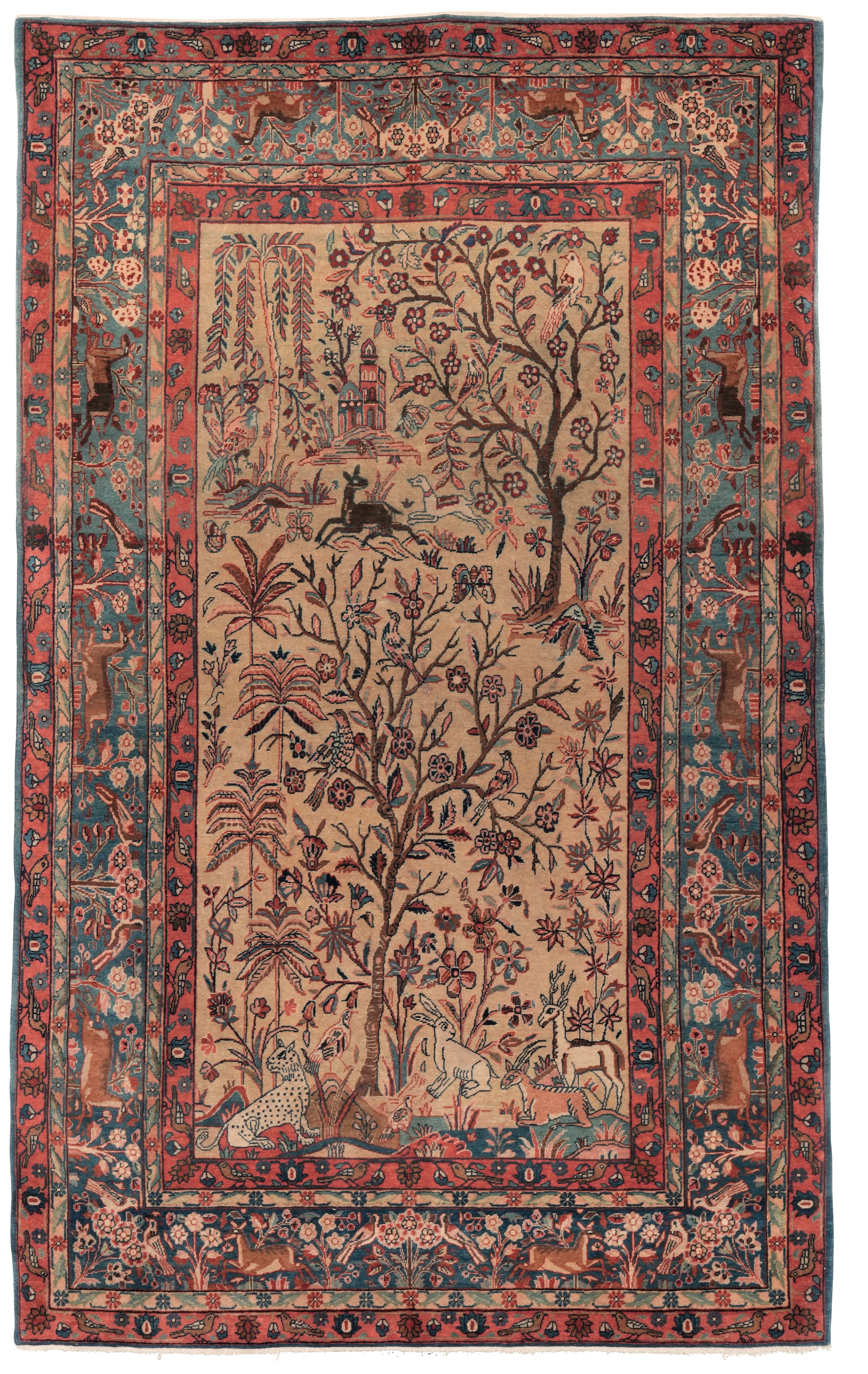 campo oro con alberi ed animali, bordura azzurra con fiori ed animali.