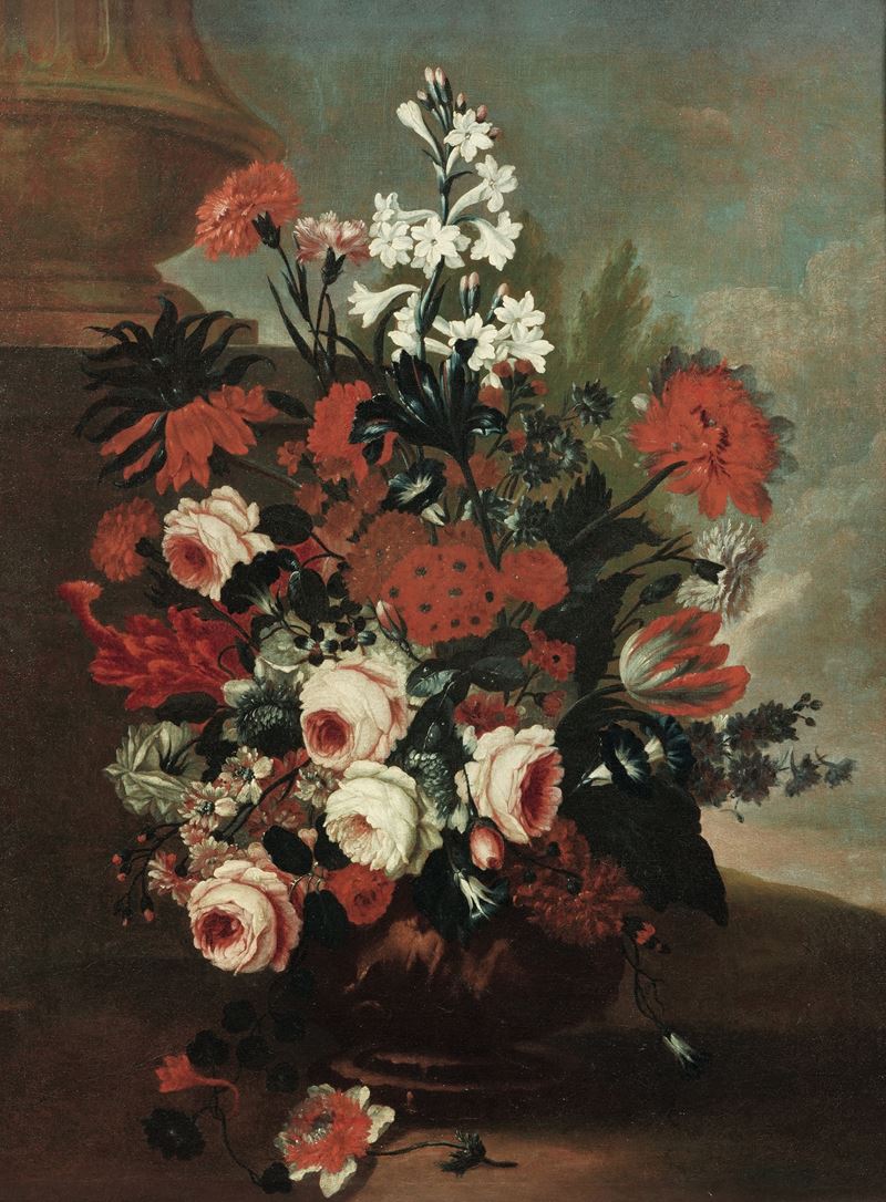 Natura morta con vaso di fiori entro paesaggio