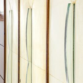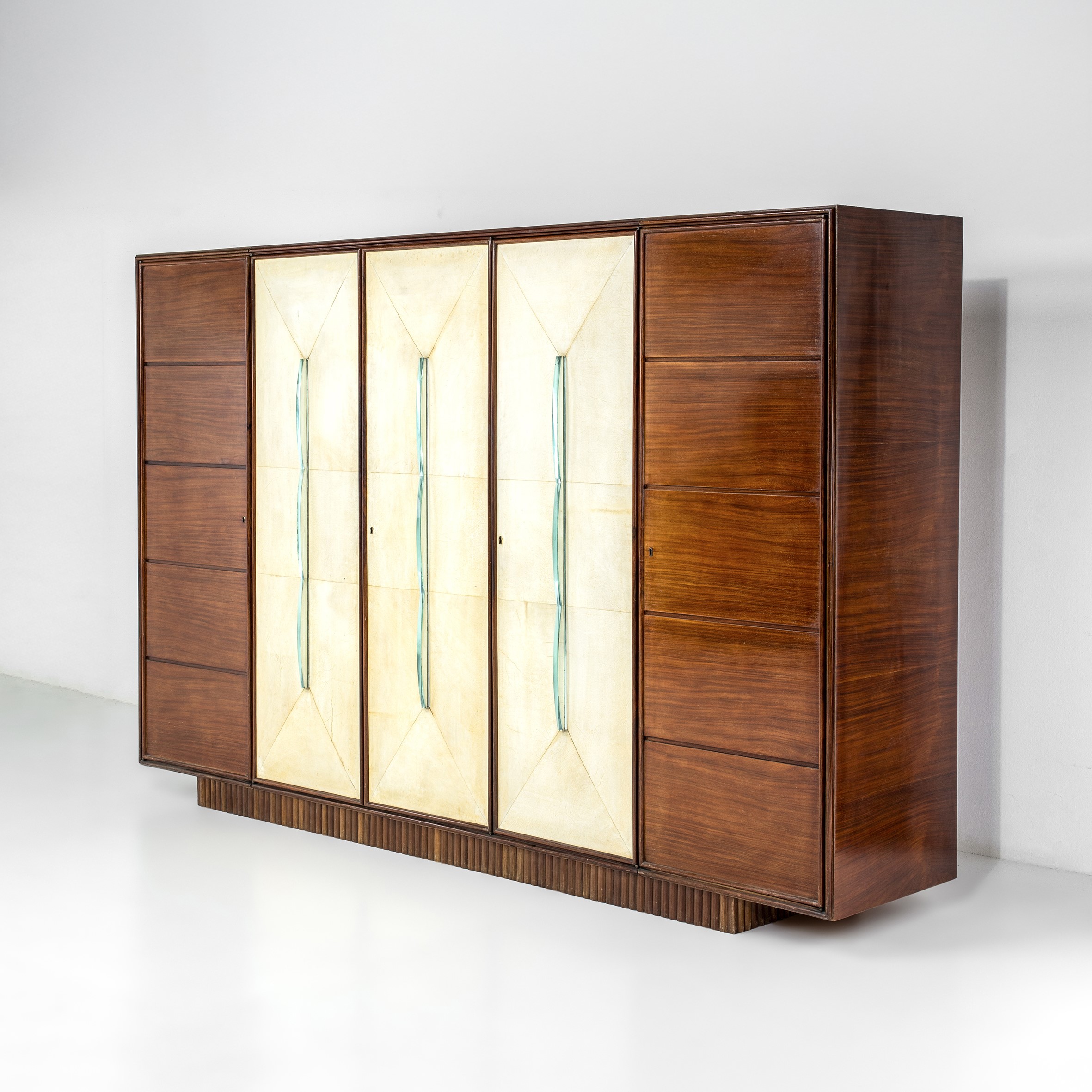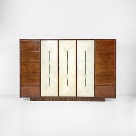 with grissinato wood base. Doors covered in parchment. Thick beveled crystal handles.