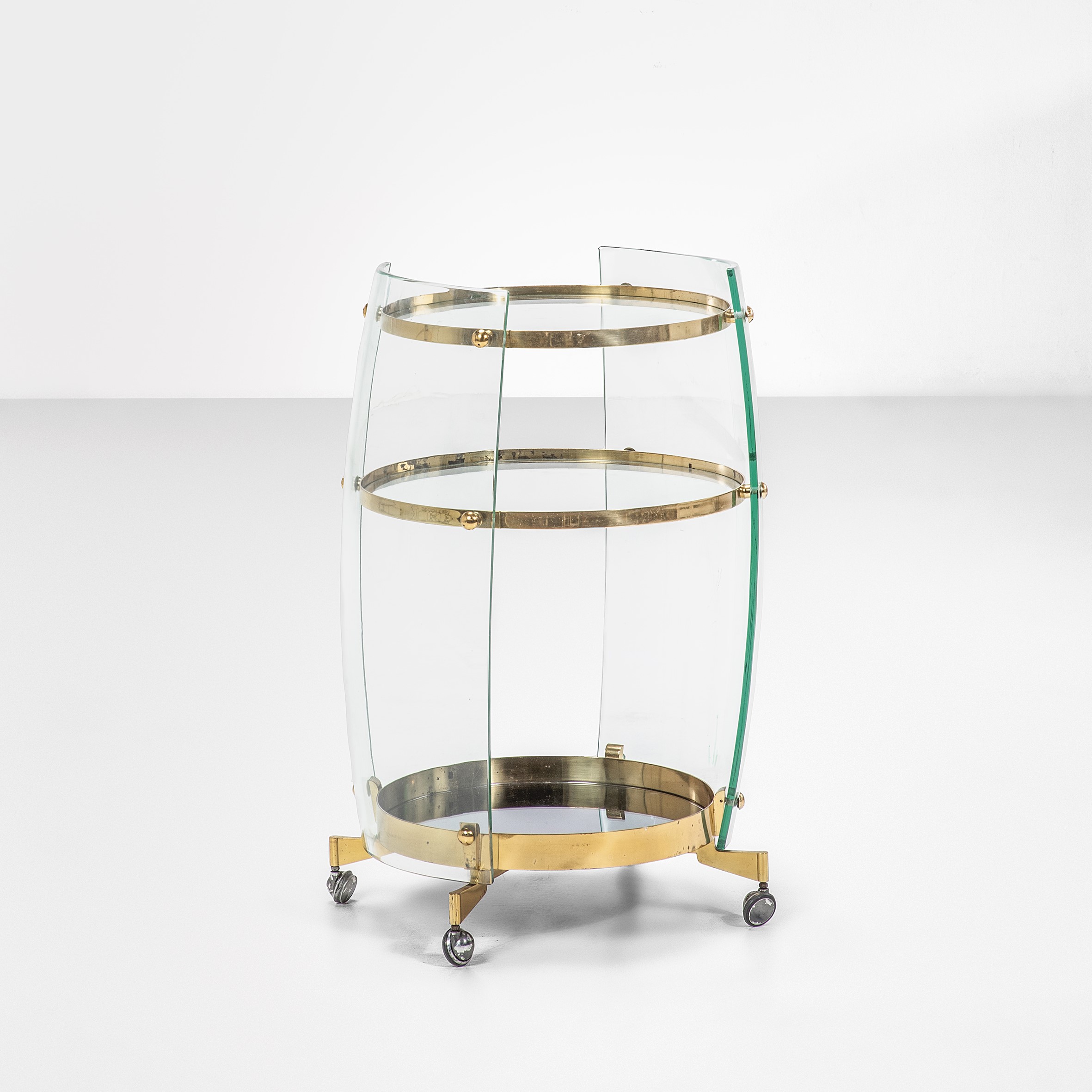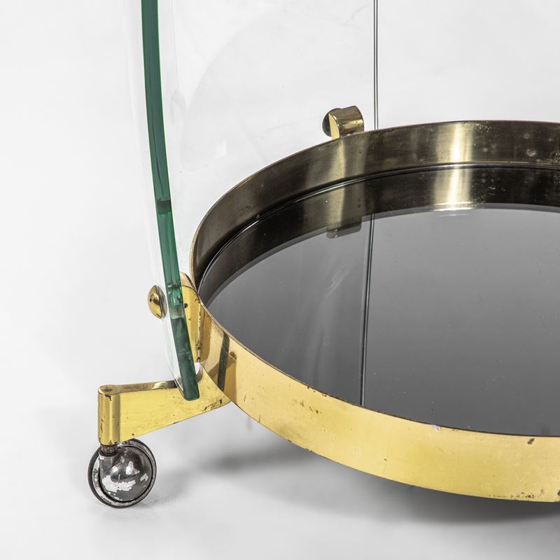 Beveled curved crystal sides and shelves. Brass structure. Mirrored glass base.
