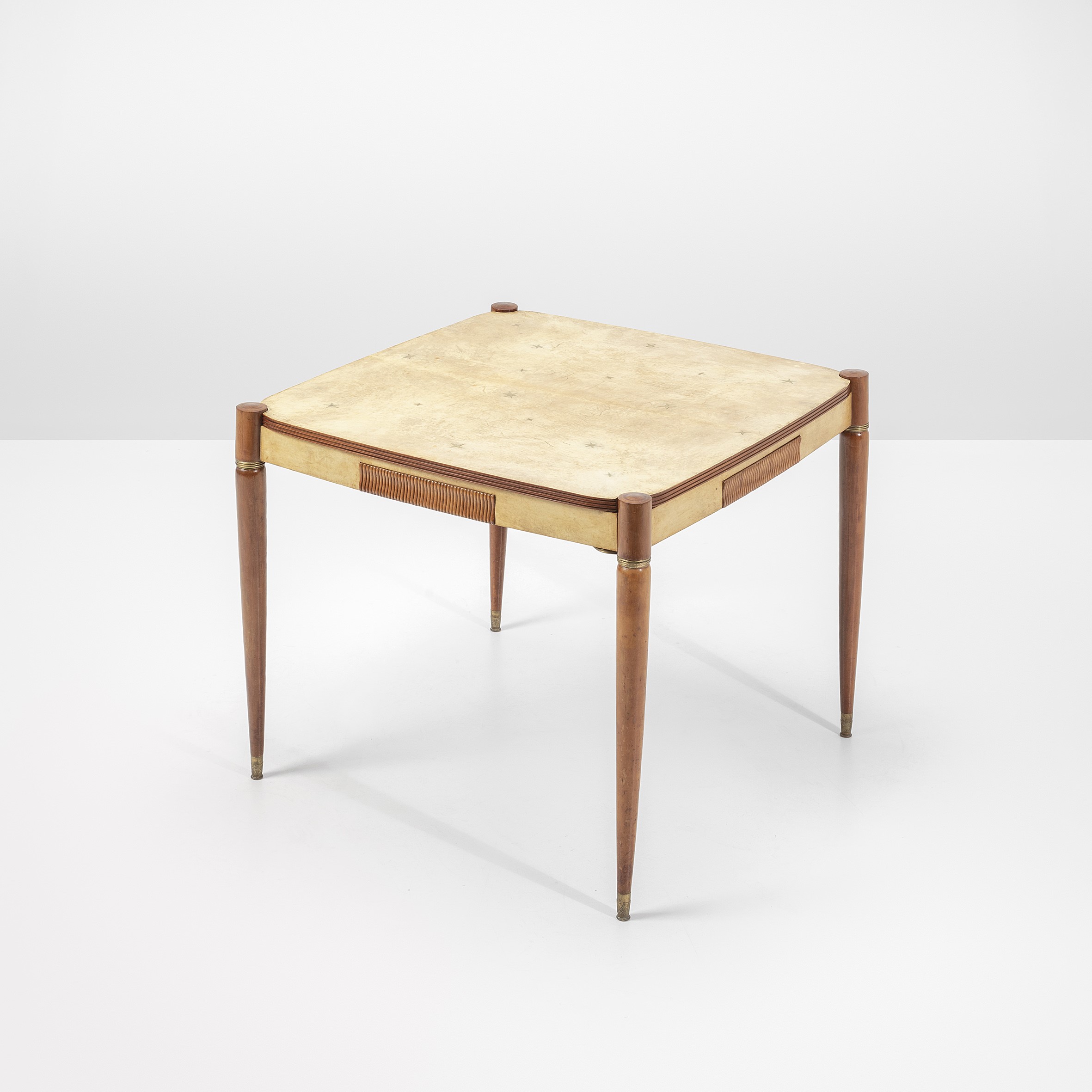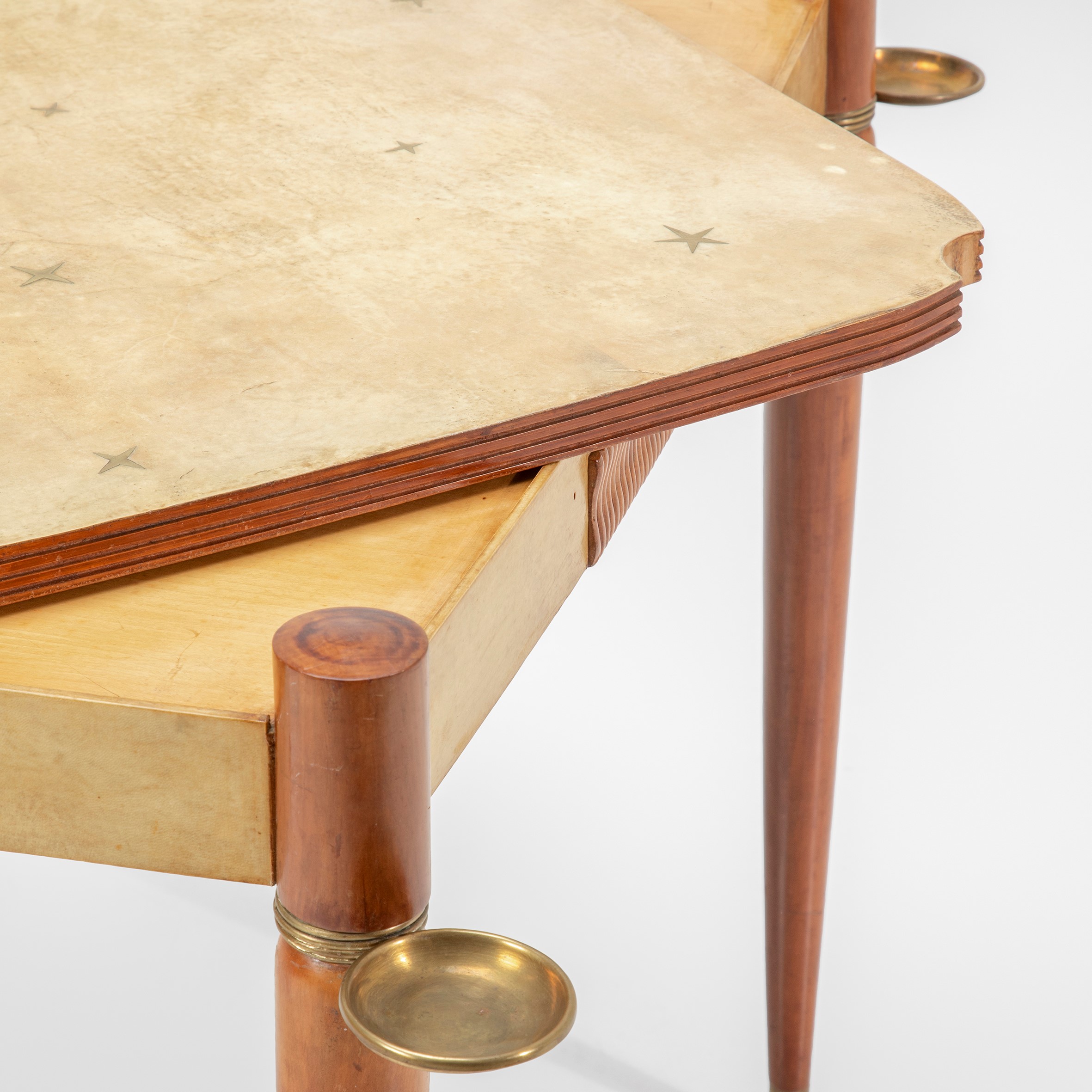 Reversible wooden top with cloth cover and parchment cover with brass inlays.
