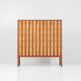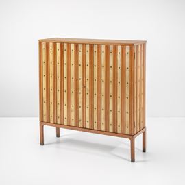 Wood structure with alternating binary strips of shaped solid wood and parchment-covered portions. Brass details.