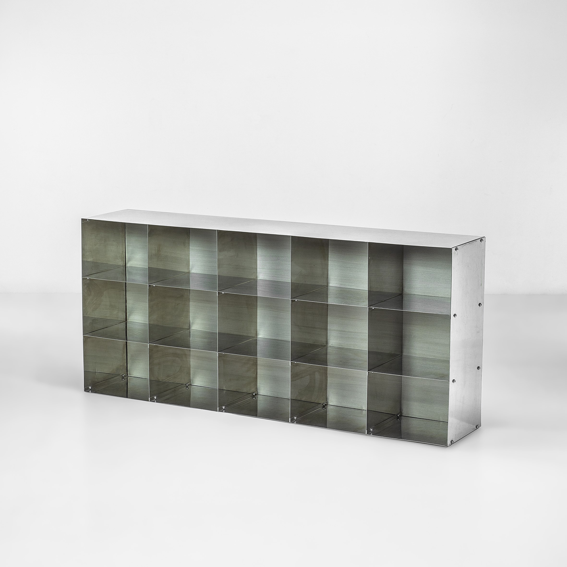 Polished aluminium and lacquered wood structure.