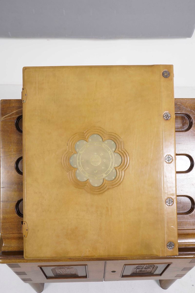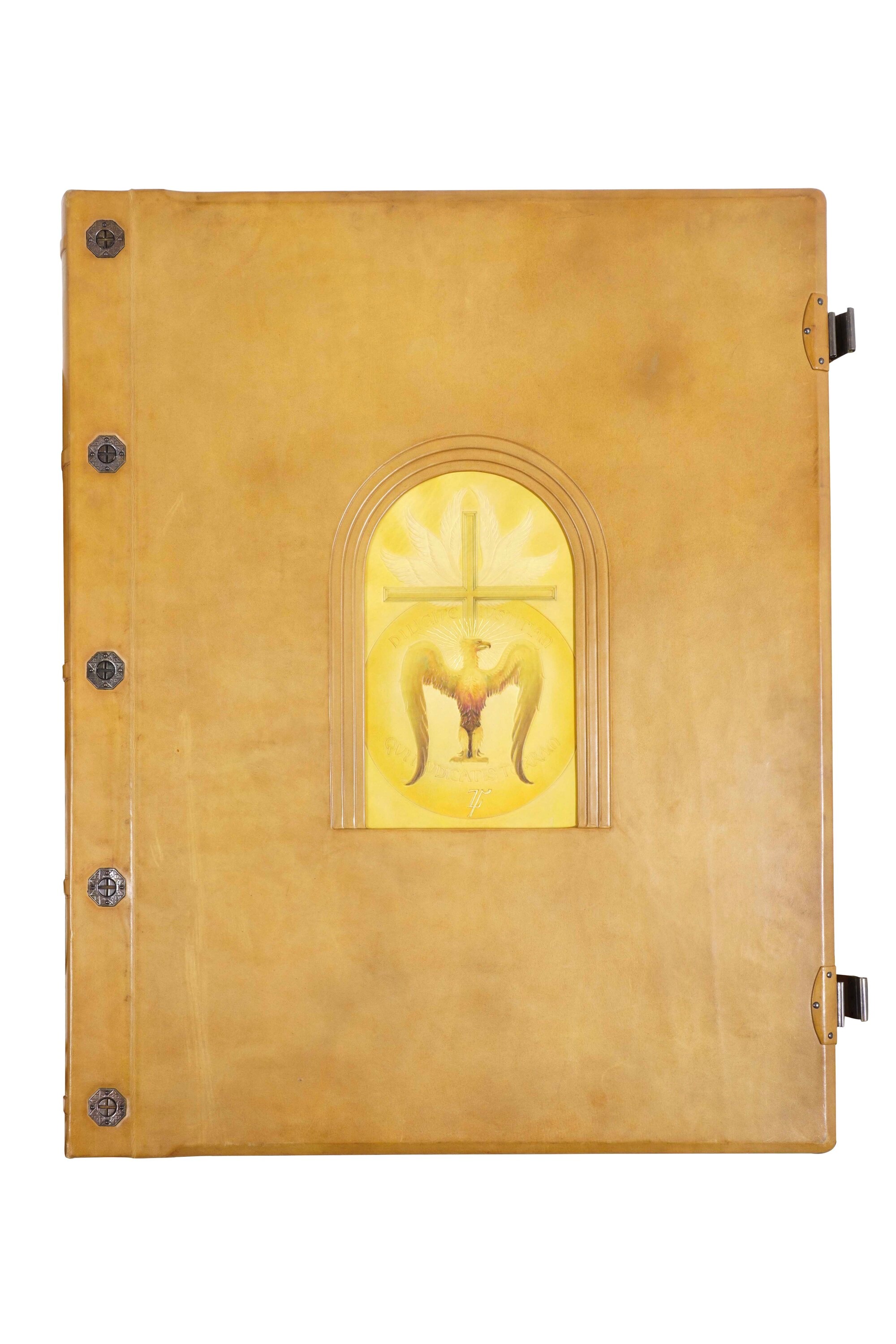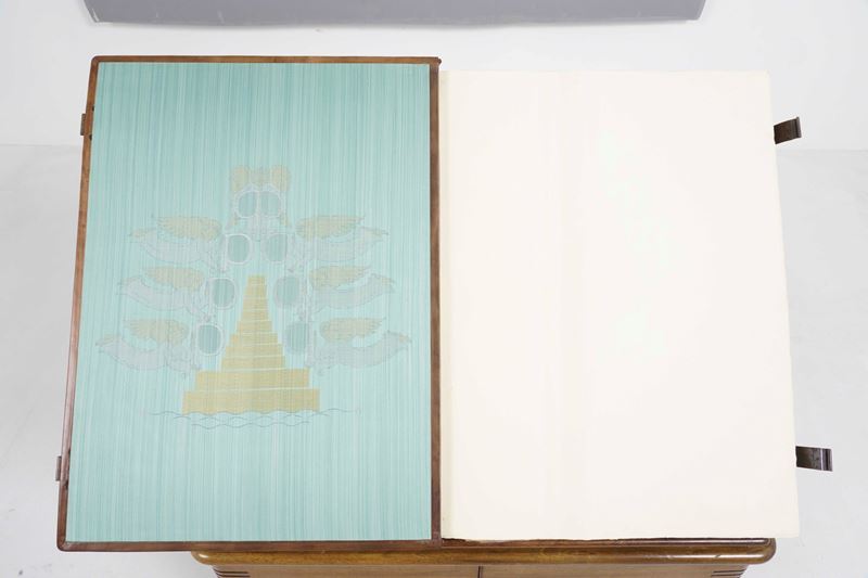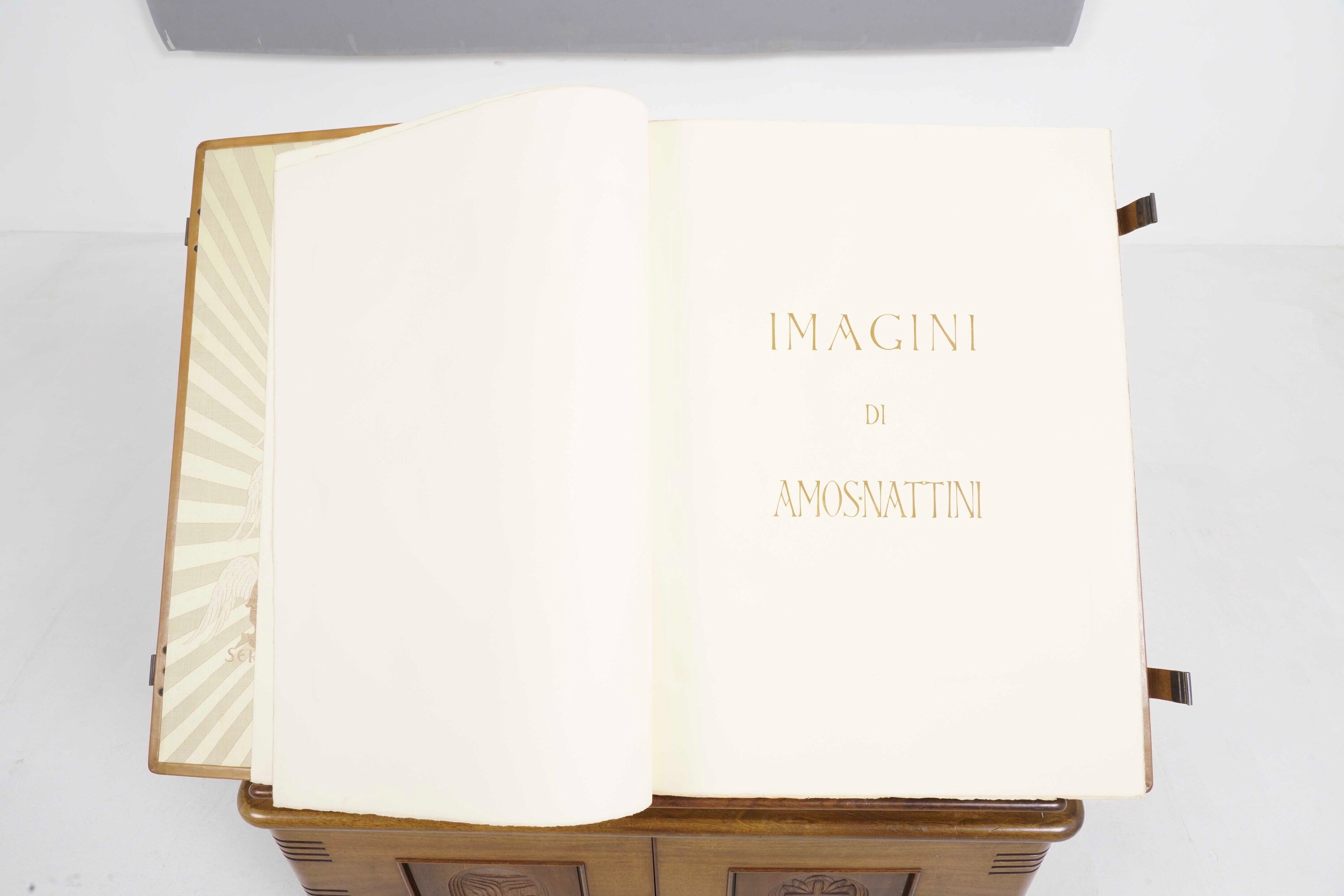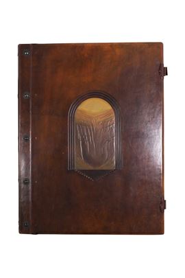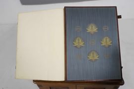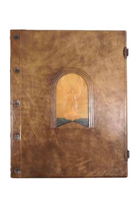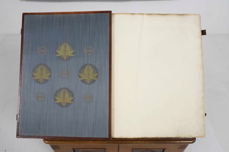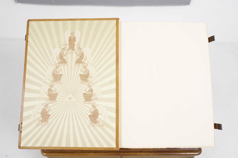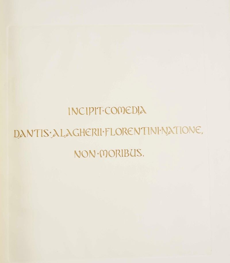Tre volumi in-folio atlantico (82x65,5 cm). Eleganti rilegature in pelle con decorazioni distinte nelle tre cantiche. Il tutto contenuto entro mobile leggio. Il nostro esemplare purtroppo risulta scompleto degli ultimi due canti del Paradiso, questo perchè, nel 1941, gli stabilimenti tipografici furono distrutti dai bombardamenti. Nel dopoguerra, i sottoscrittori furono contattati e a loro fu proposta la completazione, ma non tutti aderirono, per ragioni ovvie e ben comprensibili.