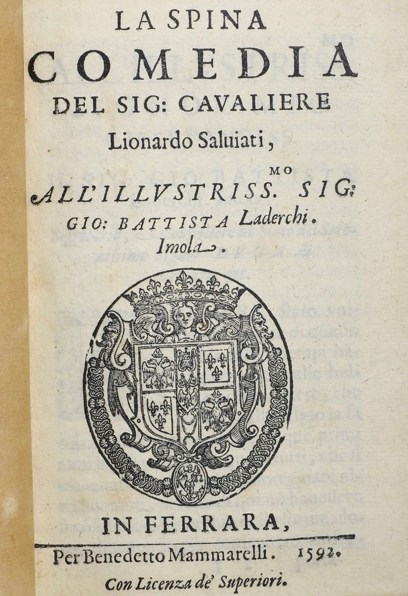 1. Salviati Leonardo (1539-1589), La Spina.., In Ferrara, per Benedetto Mammarelli, 1592. In-8°. (mm 139x9). Rilegatura in piena pelle dell'inizio del secolo XX, tagli dorati, ex libris nobiliare al contropiatto. Esemplare fresco, con margini un po' corti.