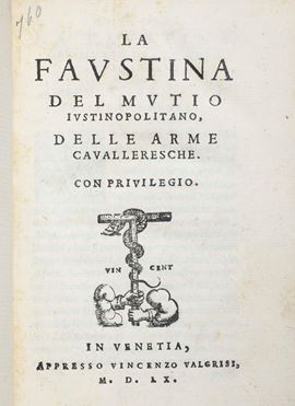 2. Iustonopolitano Muzio, La Faustina.., In Venetia, appresso Vincenzo Valgrisi, 1560. In-8°. (mm 155x96). Rilegatura in piena pelle del secolo XIX, tagli dorati, ex libris nobiliare al contropiatto, rotture alle cuffie. Esemplare fresco