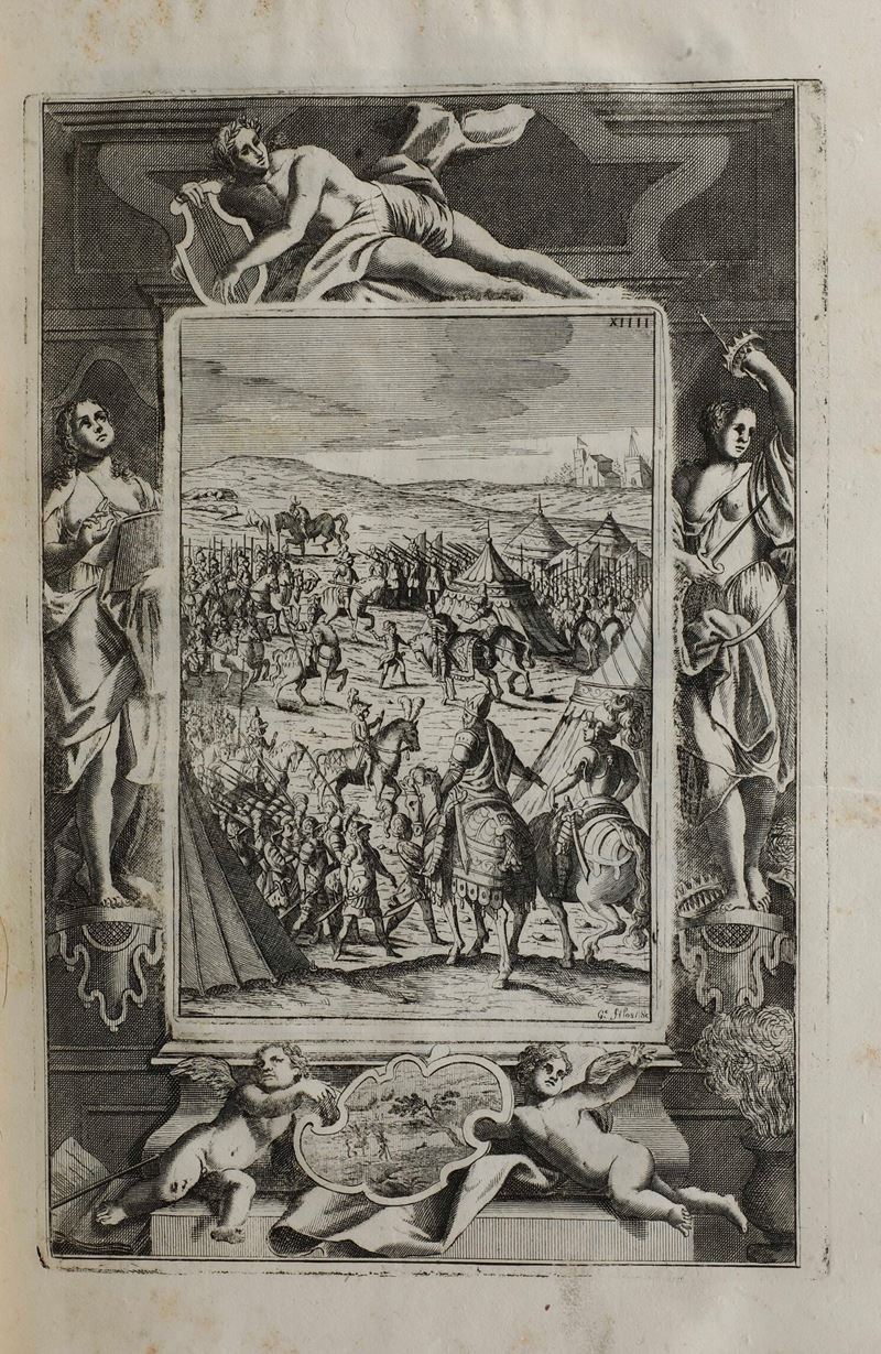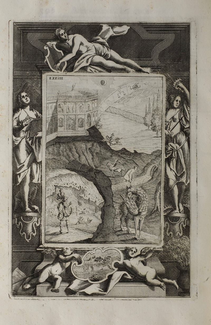 In-folio (II vol. mancante). (mm 388x260). 50 pp. nn. (1 c. bianca mancante) + 576 pp. num. + 46 tavv. f.t.. Rilegatura coeva in pergamena rigida (alcune macchie, piccole mancanze). Frontespizio con vignetta allegorica "PRO BONO MALUM", testo su due colonne impreziosito da una tavola fuori testo a inizio di ogni canto con illustrazione e ricca cornice. Esemplare fresco e marginoso con qualche foro di tarlo sulle prime e ultime carte, una nota manoscritta sull'antiporta.