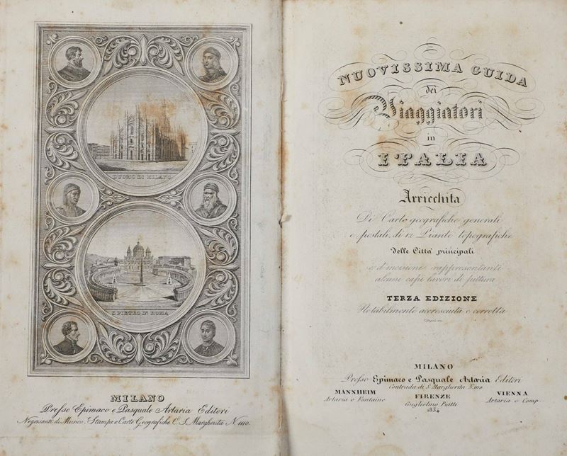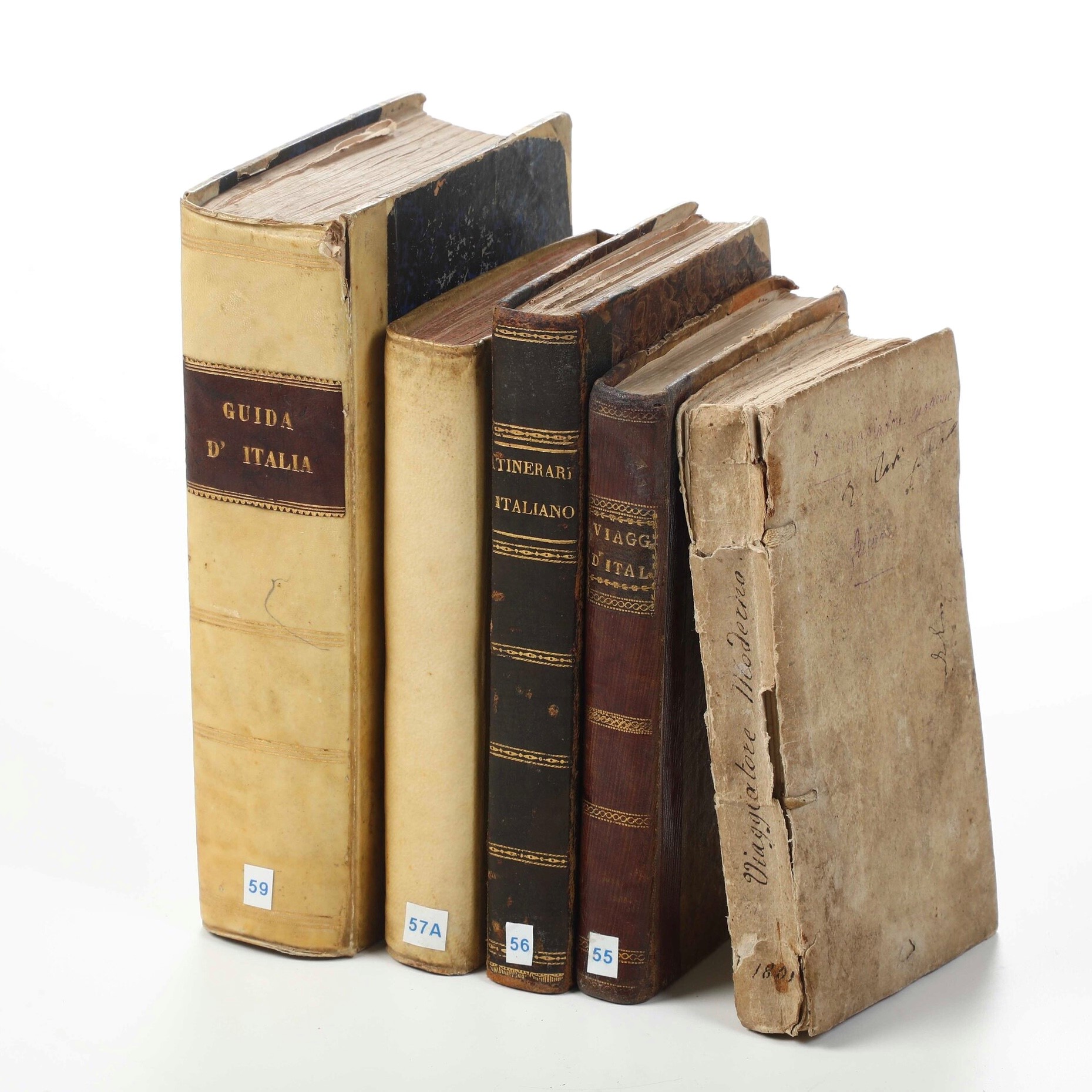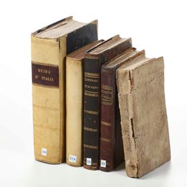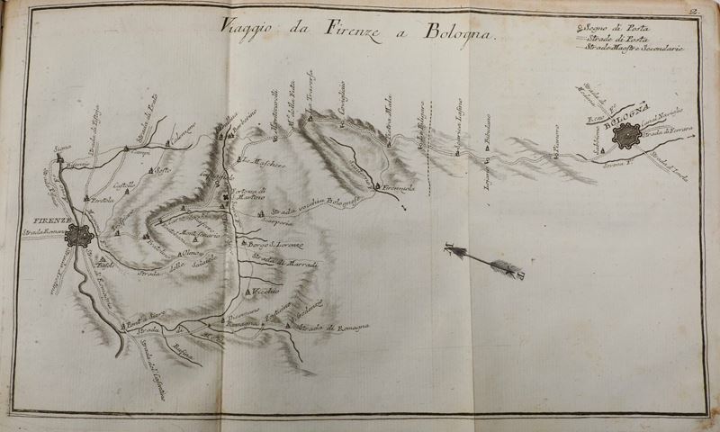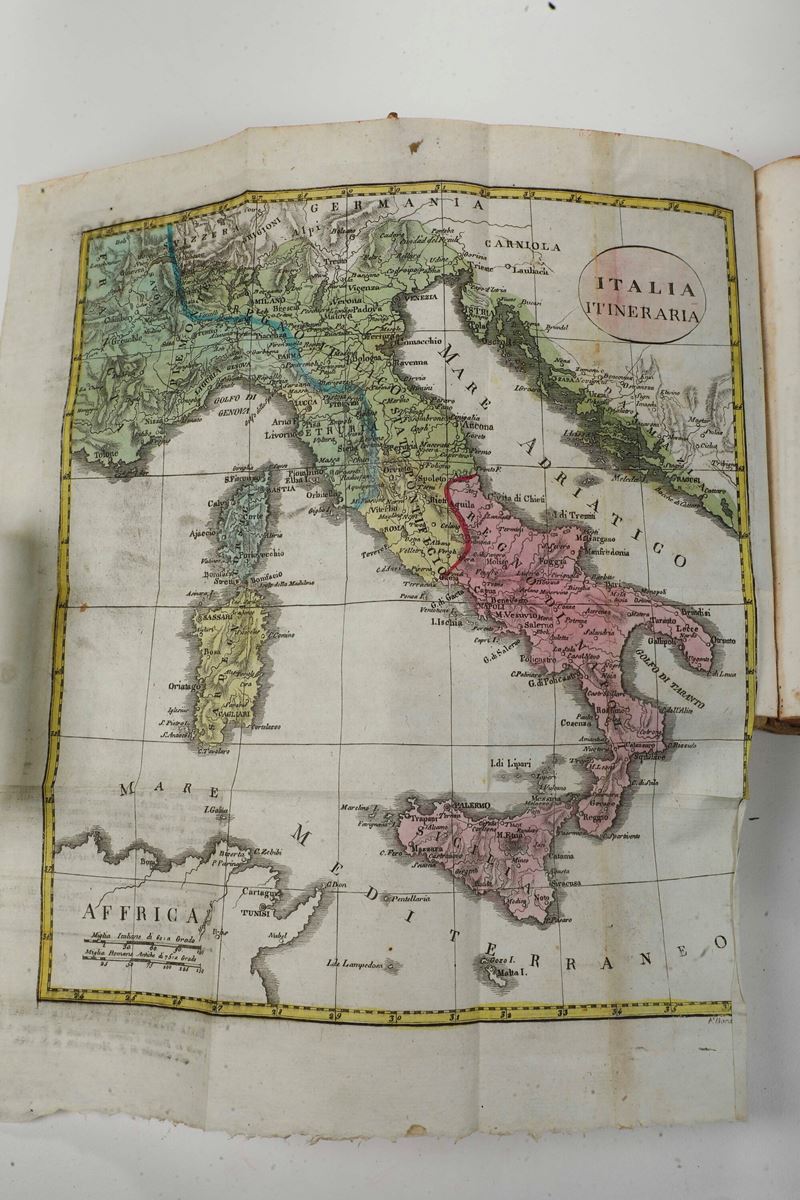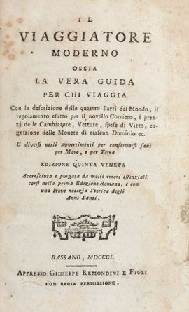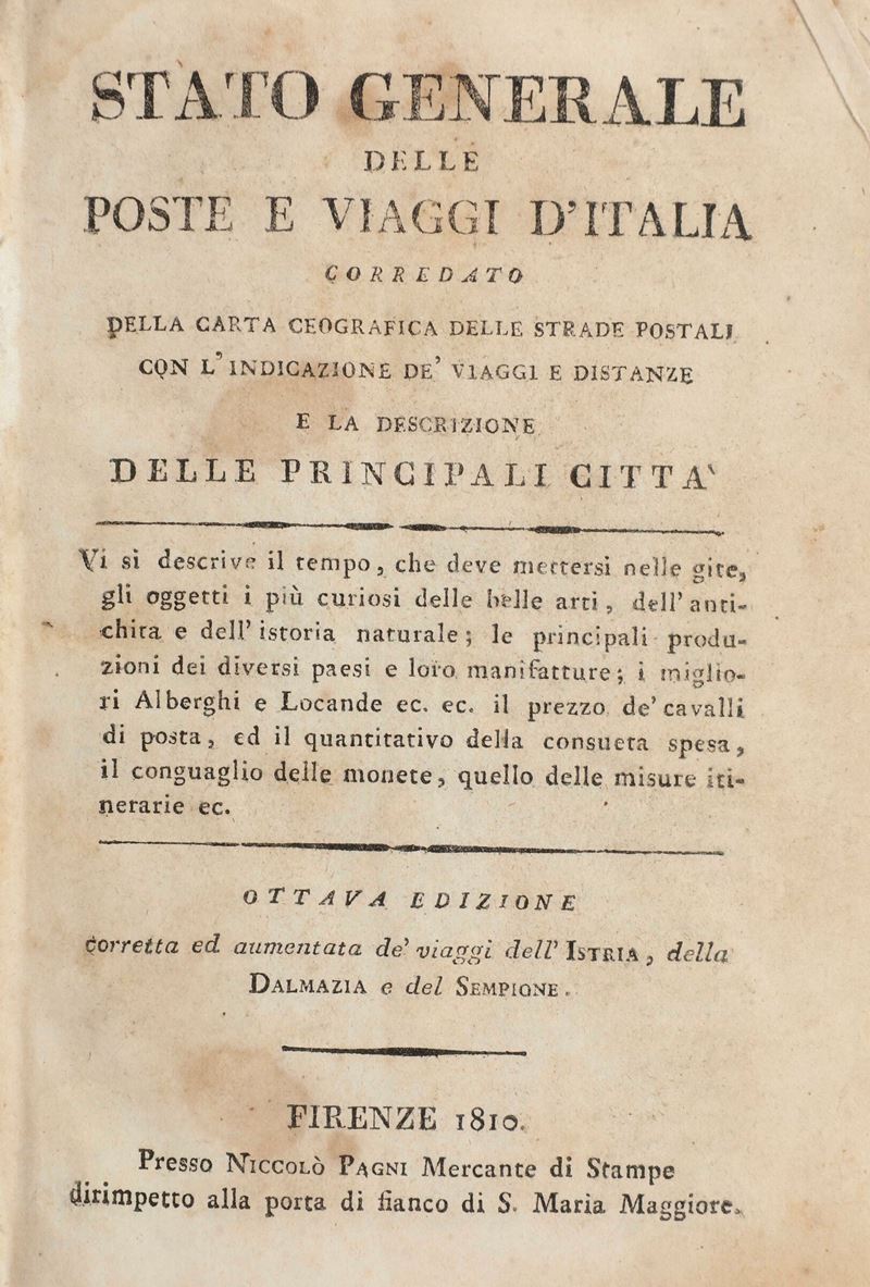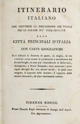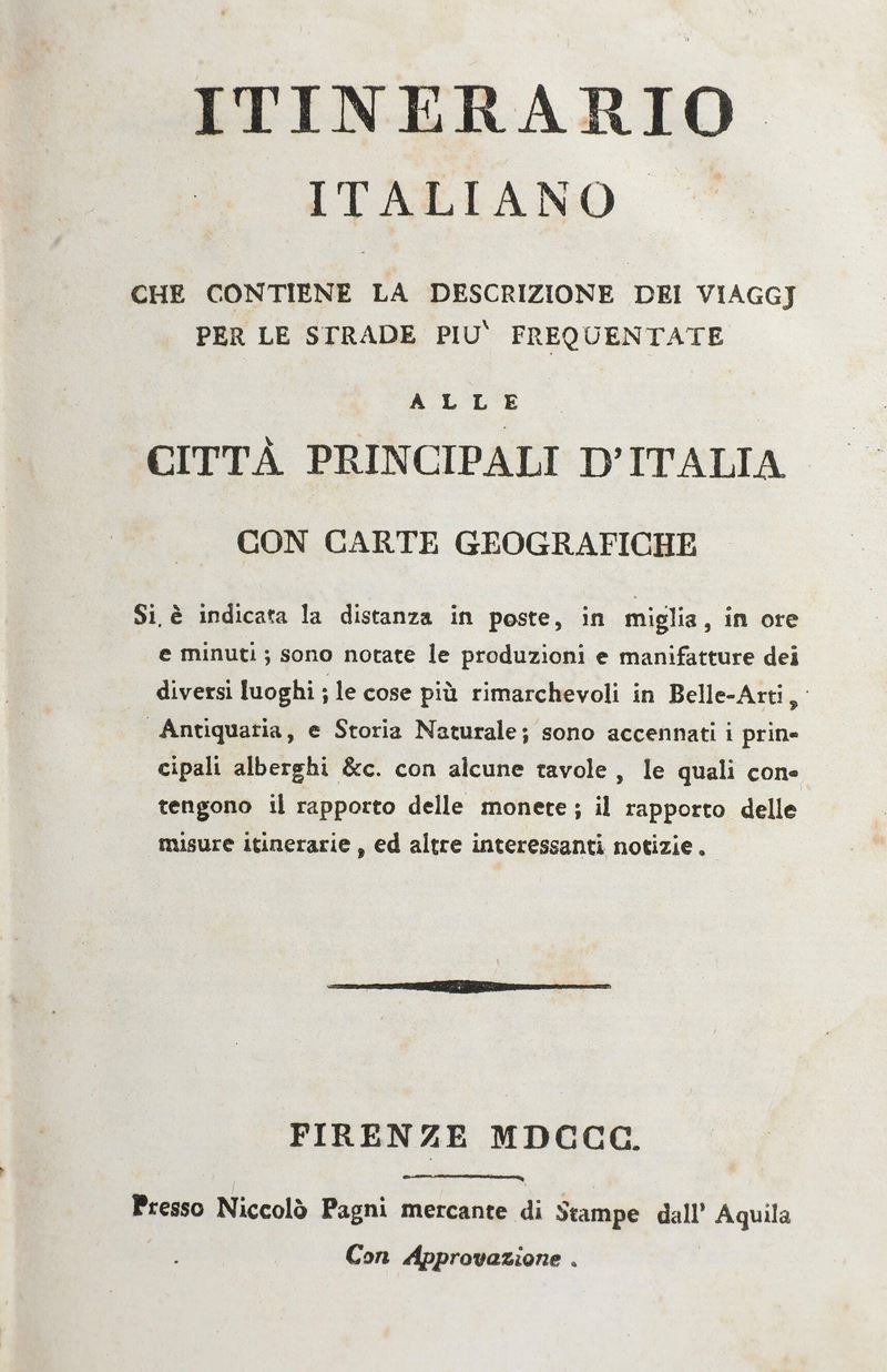 In-8°. Bella rilegatura coeva in piena pergamena. Numerose tavole ripiegate. Si uniscono nel lotto: itinerario italiano... Firenze, Pagni, 1800 rilegato in mezza pelle coeva; Stato generale delle poste e viaggi di Italia, ottava edizione, Firenze, pagni, 1810 rilegatura in mezza pelle coeva; Il viaggiatore moderno, Bassano Remondini, 1801, rilegatura coeva in cartonato alla rustica; Nuovissima guida dei viaggiatori in Italia... terza edizione, Milano, Artaria, 1834