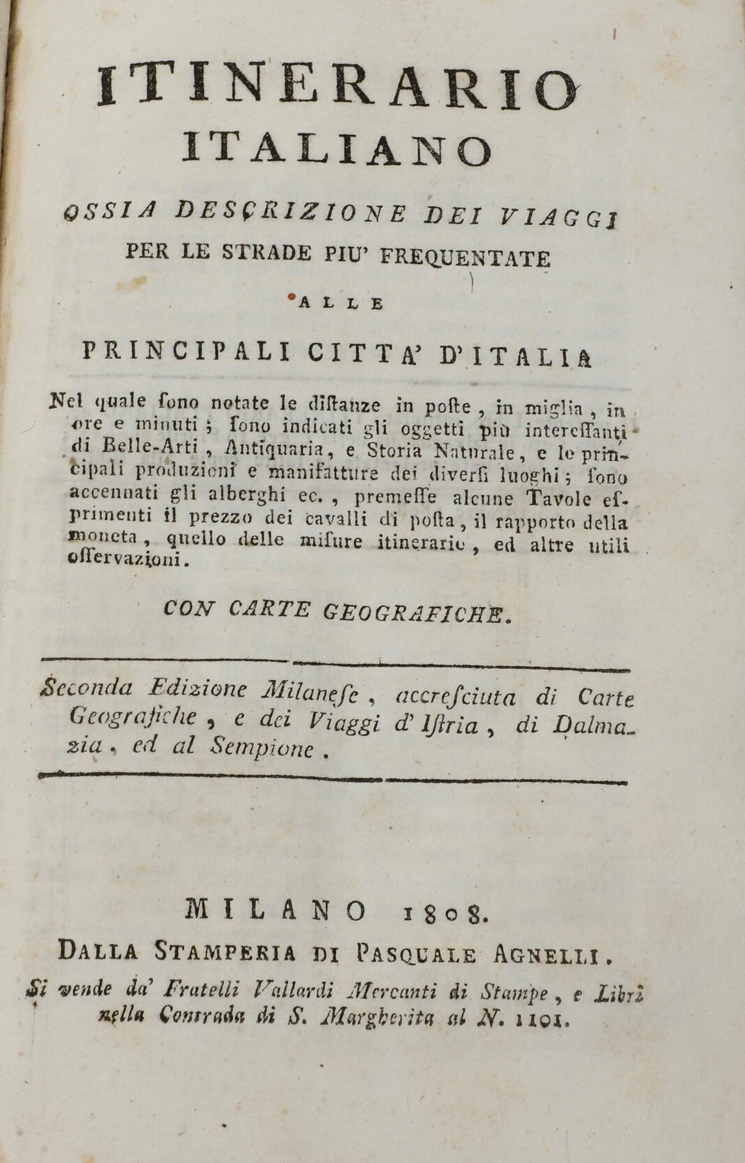 Autori vari Itinerario Italiano, Ossia descrizione dei viaggi per le strade più frequentate... con carte geografiche, Milano, Agnelli, 1808
