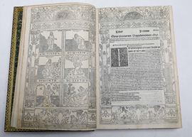 In-folio. (mm 300x207). [2] cc. + 256 cc. + [12] cc. (prima carta presumibilmente proveniente da altro esemplare?). Rilegatura in piena pelle (usure alle cerniere), tagli rossi e successivamente dorati, ex libris nobiliare al contropiatto anteriore. Seconda e terza pagina con ricca decorazione xilografica e numerose altre illustrazioni xilografiche, in particolare di città, in tutto il testo. Timbro illeggibile al verso del'ultima carta. Esemplare fresco e marginoso, eccezion fatta per il margine superiore un po' rifilato delle prime due carte, corredato da alcune note manoscritte da mano antica.