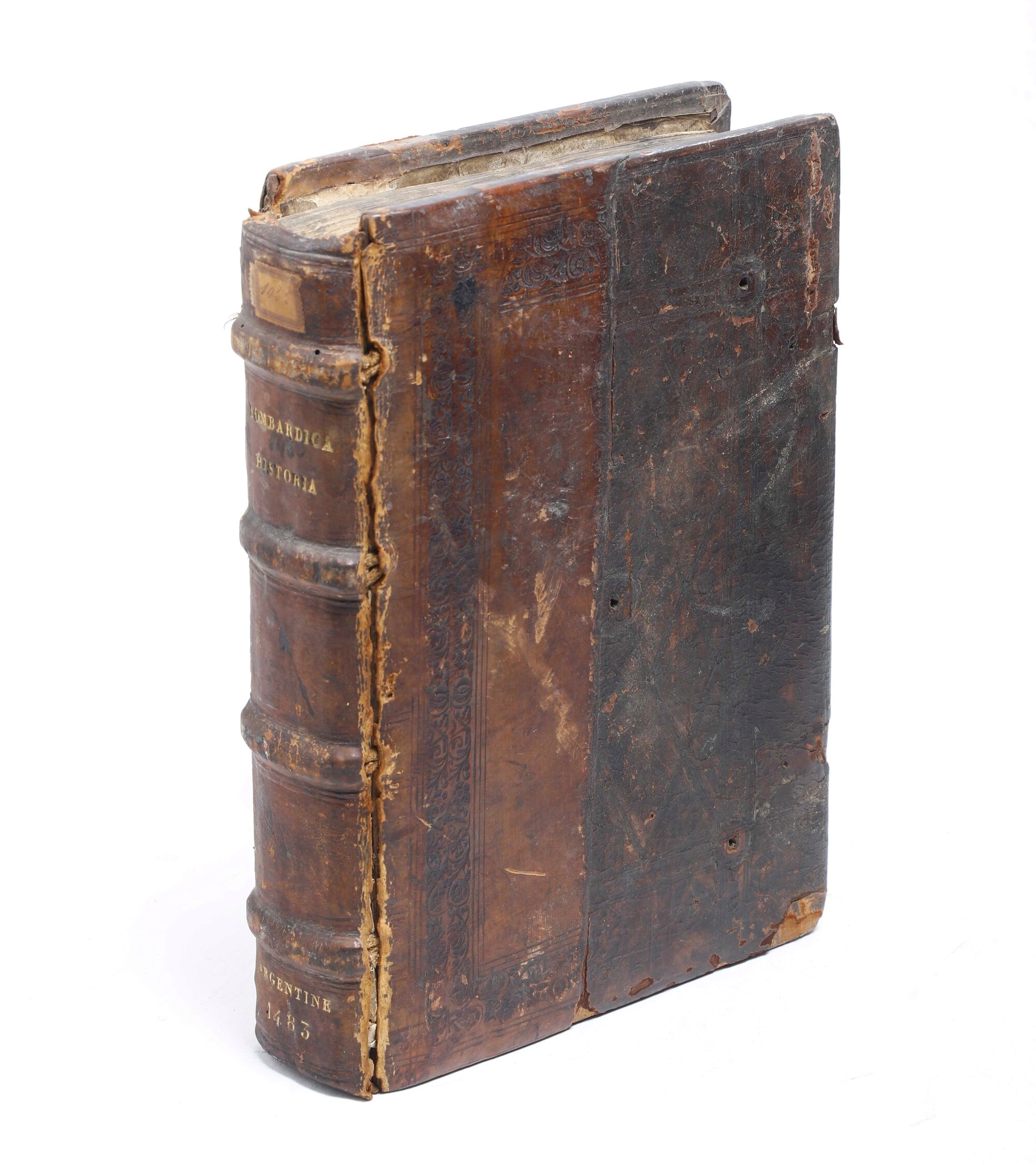 In-folio. (mm 292x200). [1] c. b., [14] c., [265] c., [2] c. b.. Rilegatura in stile monastico, con piatti in legno in piena pelle coeva, ricche decorazioni a secco sui piatti (piatto posteriore staccato e rottura alla cerniera del piatto anteriore, dorso rinforzato anticamente utilizzando altra rilegatura della stessa epoca, tracce di fermagli e borchie metalliche). Antichi ex-libris manoscritti e uno più recente a stampa applicato al contropiatto anteriore. Iniziali e letterine guida elegantemente rubricate in rosso e blu, testo su due colonne. Alcune annotazioni marginali di mano coeva. Bell'esemplare genuino, con grande capolettera miniato al recto della carta "incipit tabula".