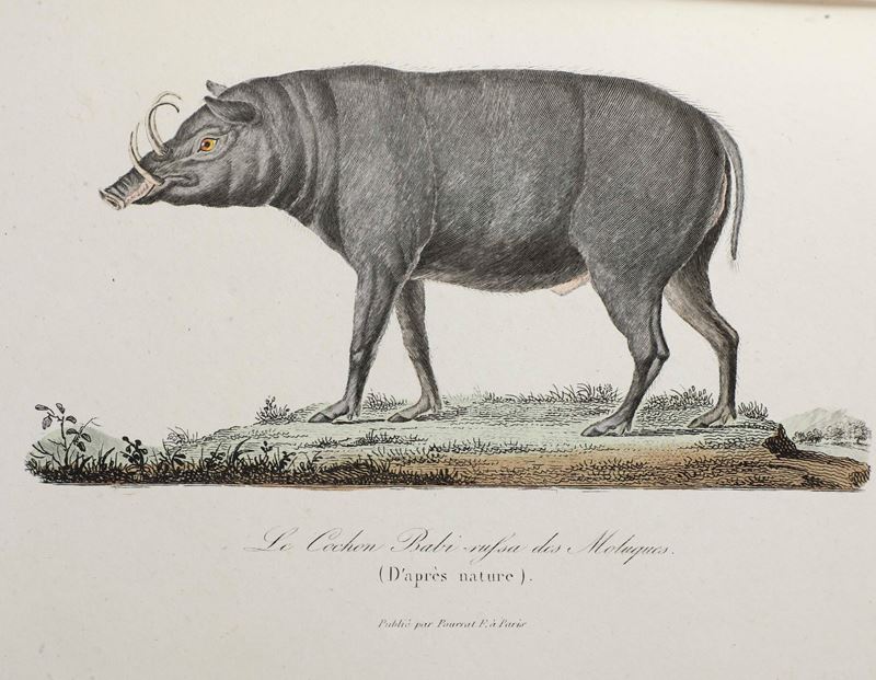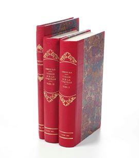 Due voll. in-4° e uno con le illustrazioni. (mm 273x178). Rilegatura in mezzo marocchino e angoli, piatti marmorizzati (brossure editoriale gialla con tit. inquadrati da bordura conservate). Ritratto dell'autore, tre tavv. ripiegate e 19 a incisioni colori nei due volumi di testo, quarantadue incisioni nel volume con illustrazioni; vignette litografiche al frontespizio.