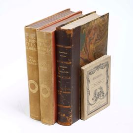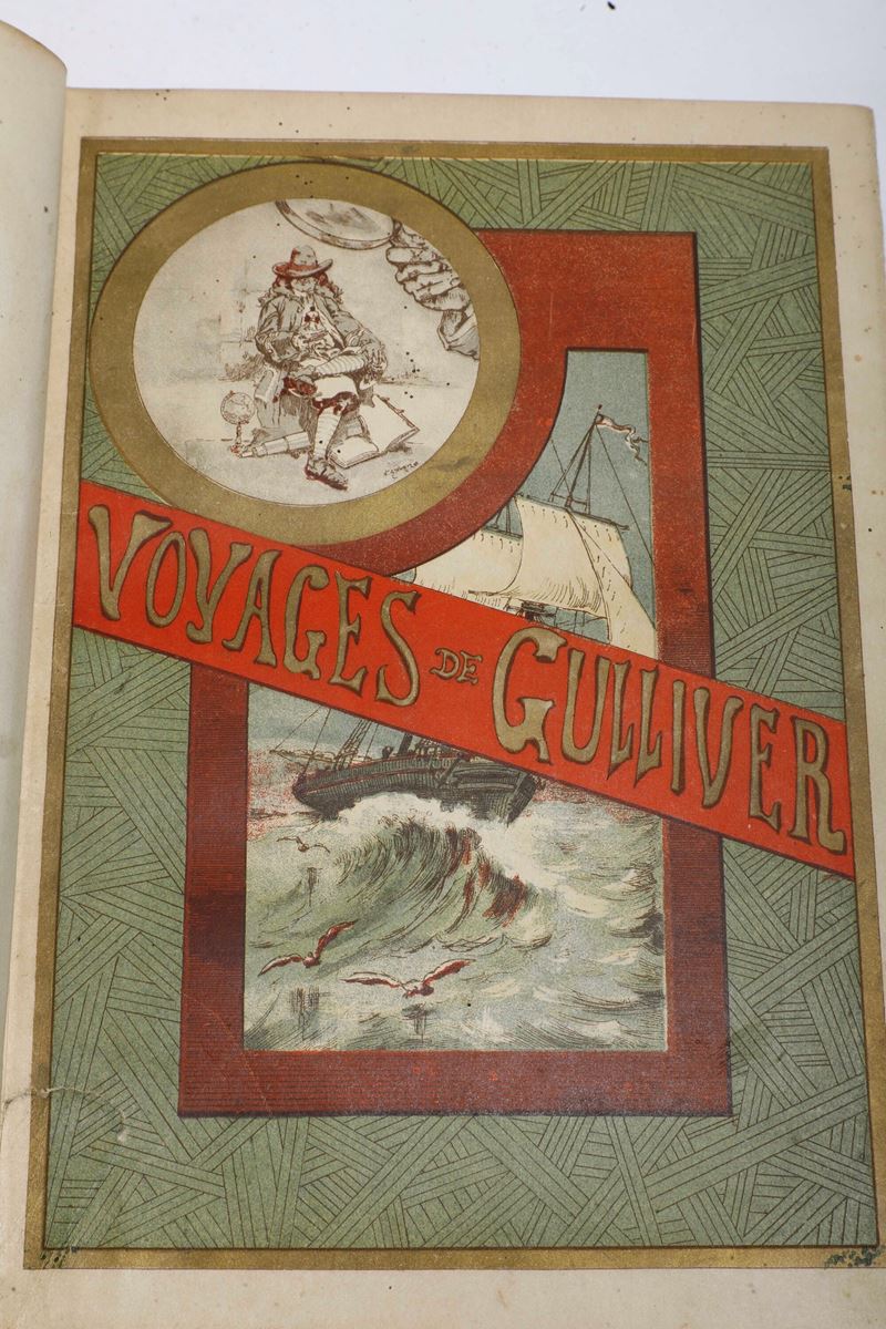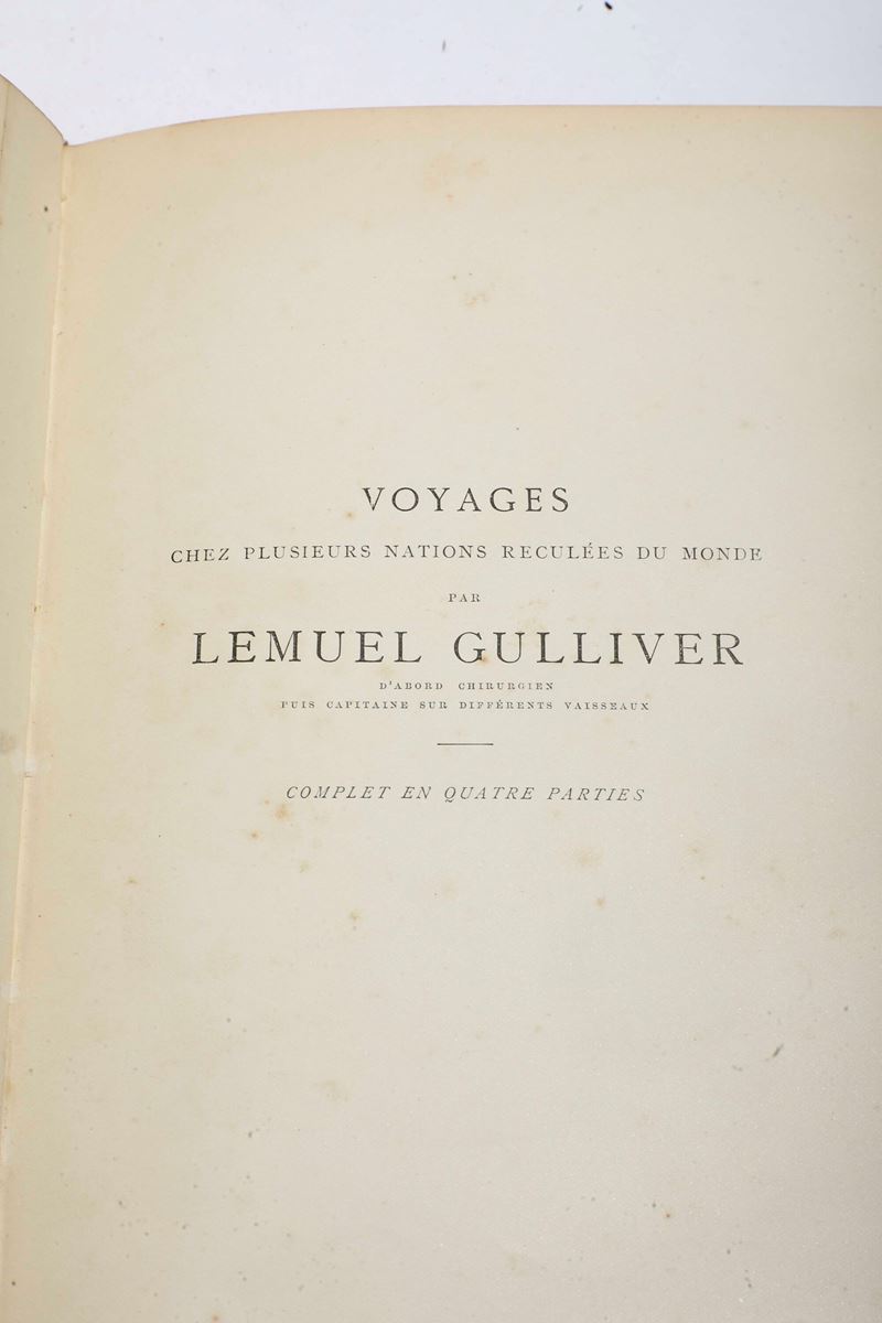4. Jonathan Swift, Voyage...de Lemuel Gulliver..., Paris, A. Quantin, senza data (ma 1884), belle illustrazioni di Poirson a colore nel testo, legatura in mezza pelle con piatti marmorizzati, titolo e autore impressi in oro al dorso.