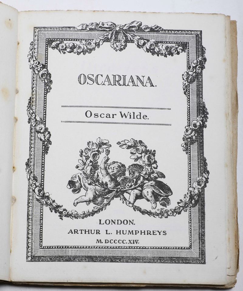 1. Oscar Wilde, Oscariana, London, Arthur L Humphreys, 1914, legatura originale in cartonato con frontespizion stampato sul piatto anteriore, esemplare in barbe con dedica manoscritta in principio;