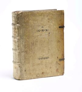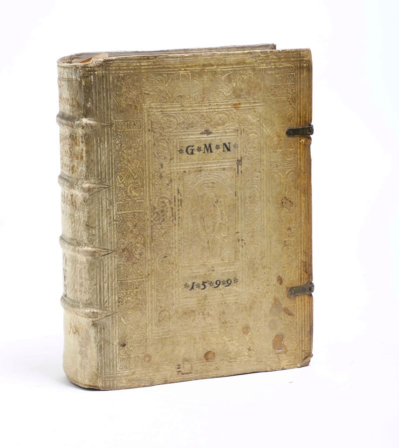 In-4° (mm 230x170). I parte [8], 47, [1], 184, [40] pp.; II parte 288 [i.e. 292], [28] cc.. Rilegatura in piena pergamena probabilmente tedesca del XVI secolo con piatti con decoro impresso con allegoria della giustizia sul fronte e Lucrezia al retro, entrambe contornate da scene del nuovo testamento, sul fronte sigla G*M*N* e data 1599 manoscritte; chiusura a fermaglio in ferro, tagli rossi, al contropiatto ex libris nobiliare. Presenti nel testo numerose belle incisioni, in particolare di carte geografiche. Importante legatura in piena pergamena probabilmente tedesca del XVI secolo con piatti con decoro impresso con allegoria della giustizia sul fronte e Lucrezia al retro, entrambe contornate da scene del nuovo testamento, sul fronte segla G*M*N* e data 1599 manoscritte, dorso a cinque nervi con titolo dell'opera (poco leggibile); chiusura a fermaglio in ferro, tagli rossi, al contropiatto ex libris nobiliare. Esemplare in buone condizioni generali, con lievi bruniture.