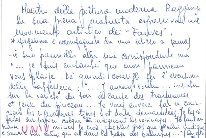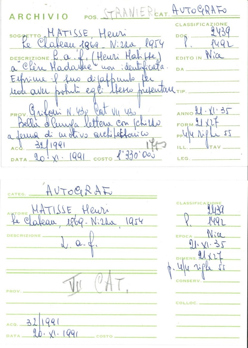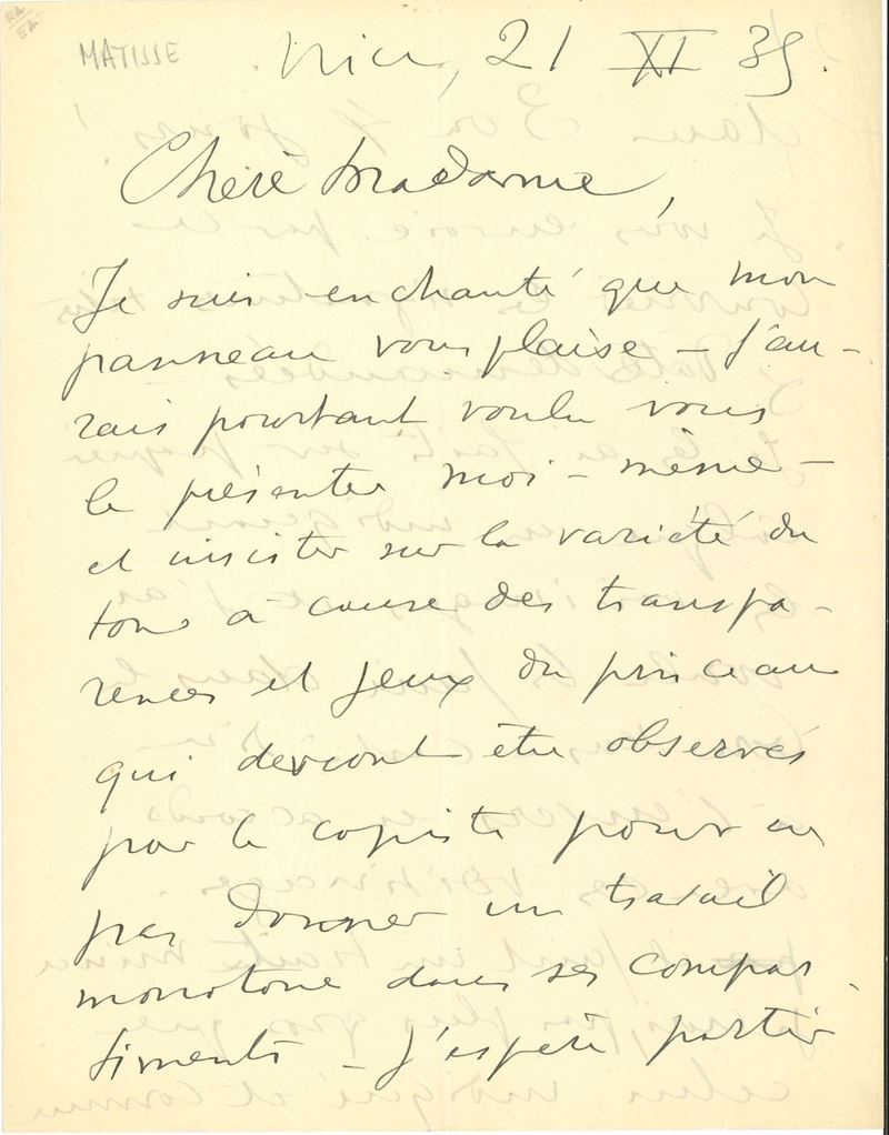 Matisse Henri (1869 - 1954) Lettera autografa, indirizzata a una non meglio identificata “Chere Madame”. Nizza, 21-11-193 [..]
