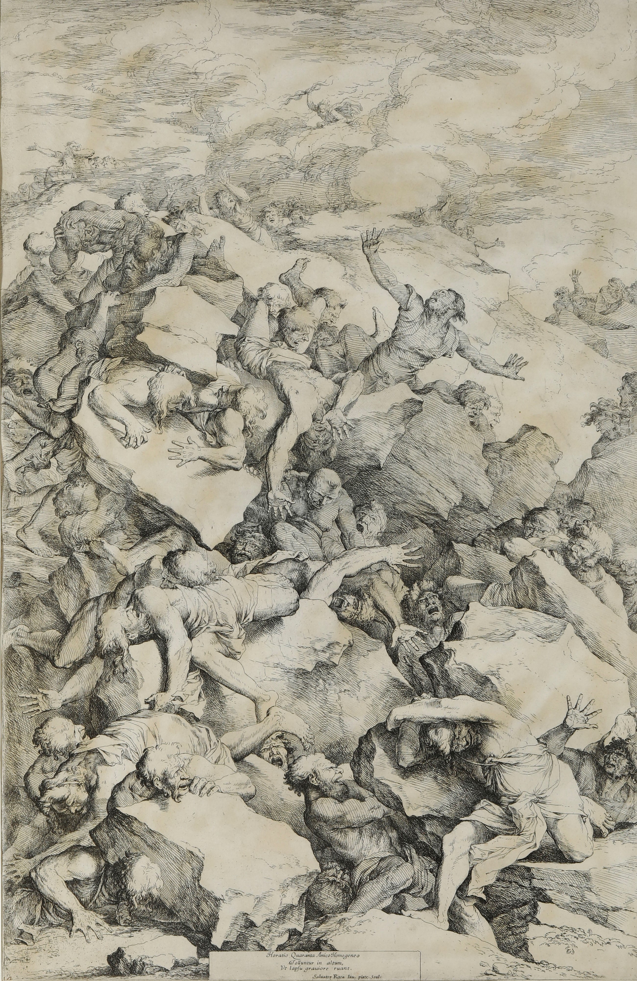 Acquaforte rifinita a puntasecca (mm 725x473). Secondo stato di due. Cartiglio in basso al centro che reca l'iscrizione "Tolluntur in altum, / Ut lapsu graviore ruant. / Salvator Rosa Inv. pinx. Scul."; entro cornice. Lievi bruniture ma buon esemplare