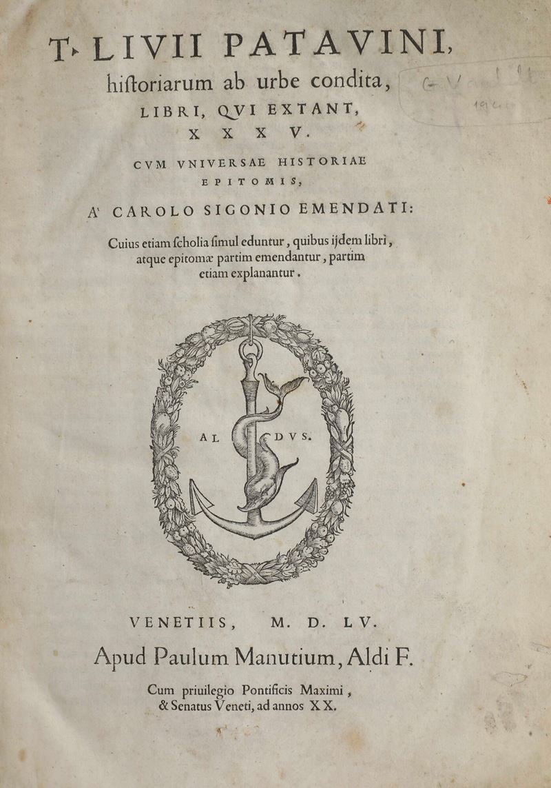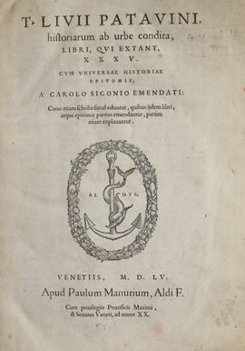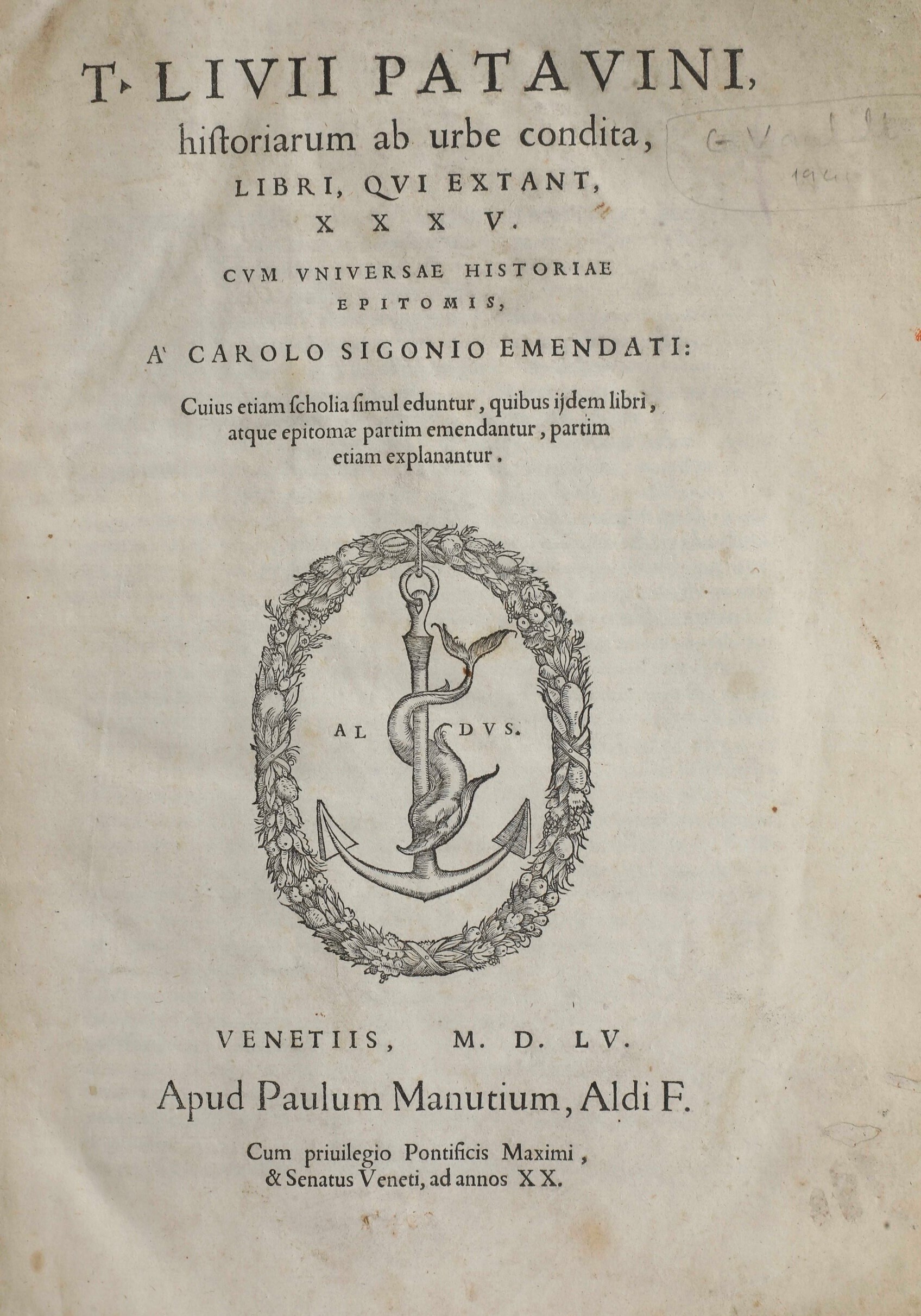 Si aggiunge nel lotto: Tito Livio, Historiarum Ab Urbe Condita, Libri XXXV... Venezia, Paolo Manuzio, 1555. In-folio. Rilegatura antica in pergamena rigida. Annotazioni manoscritte ai margini
