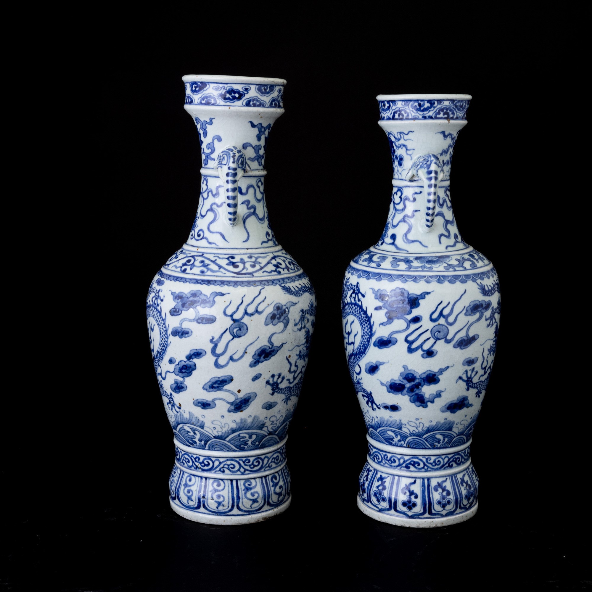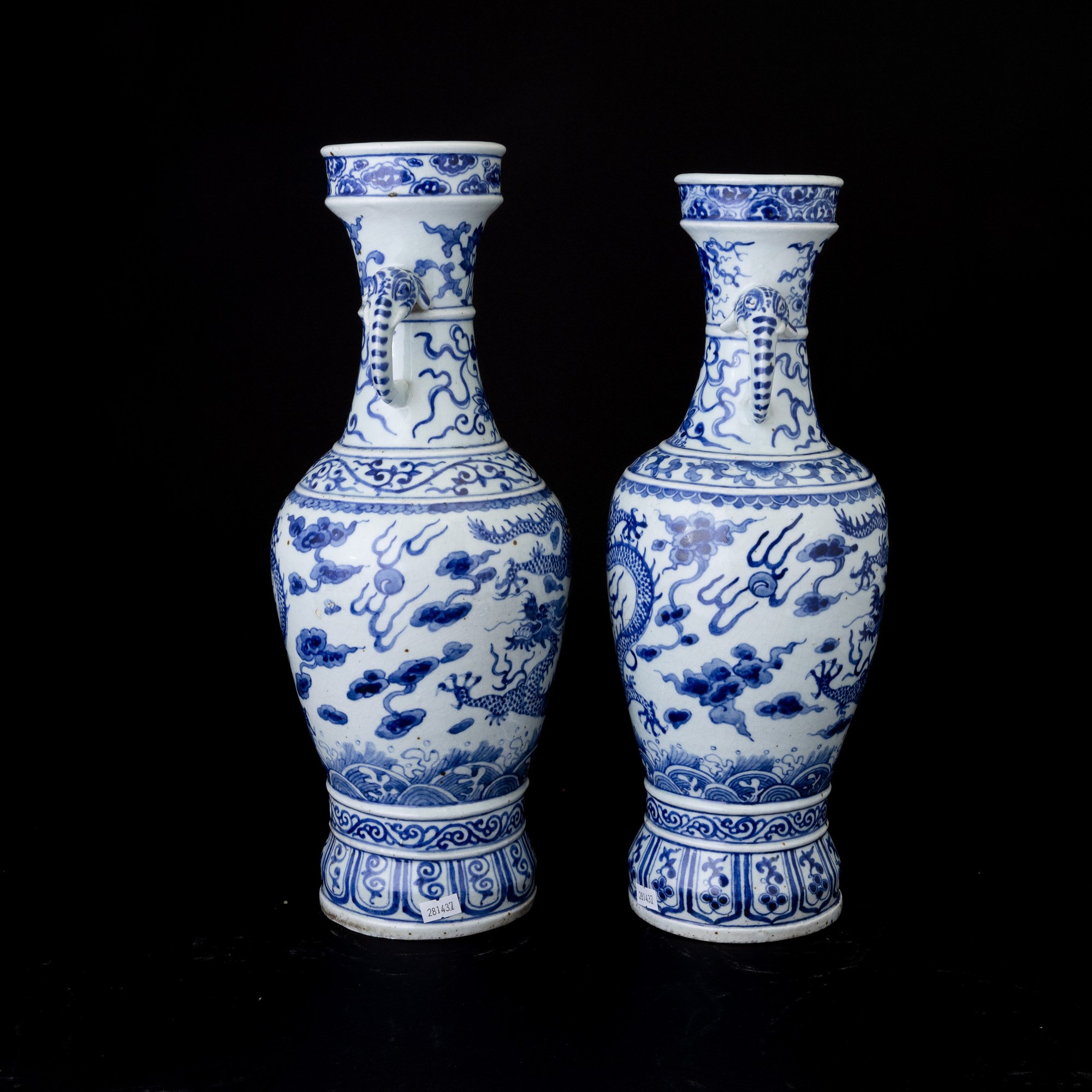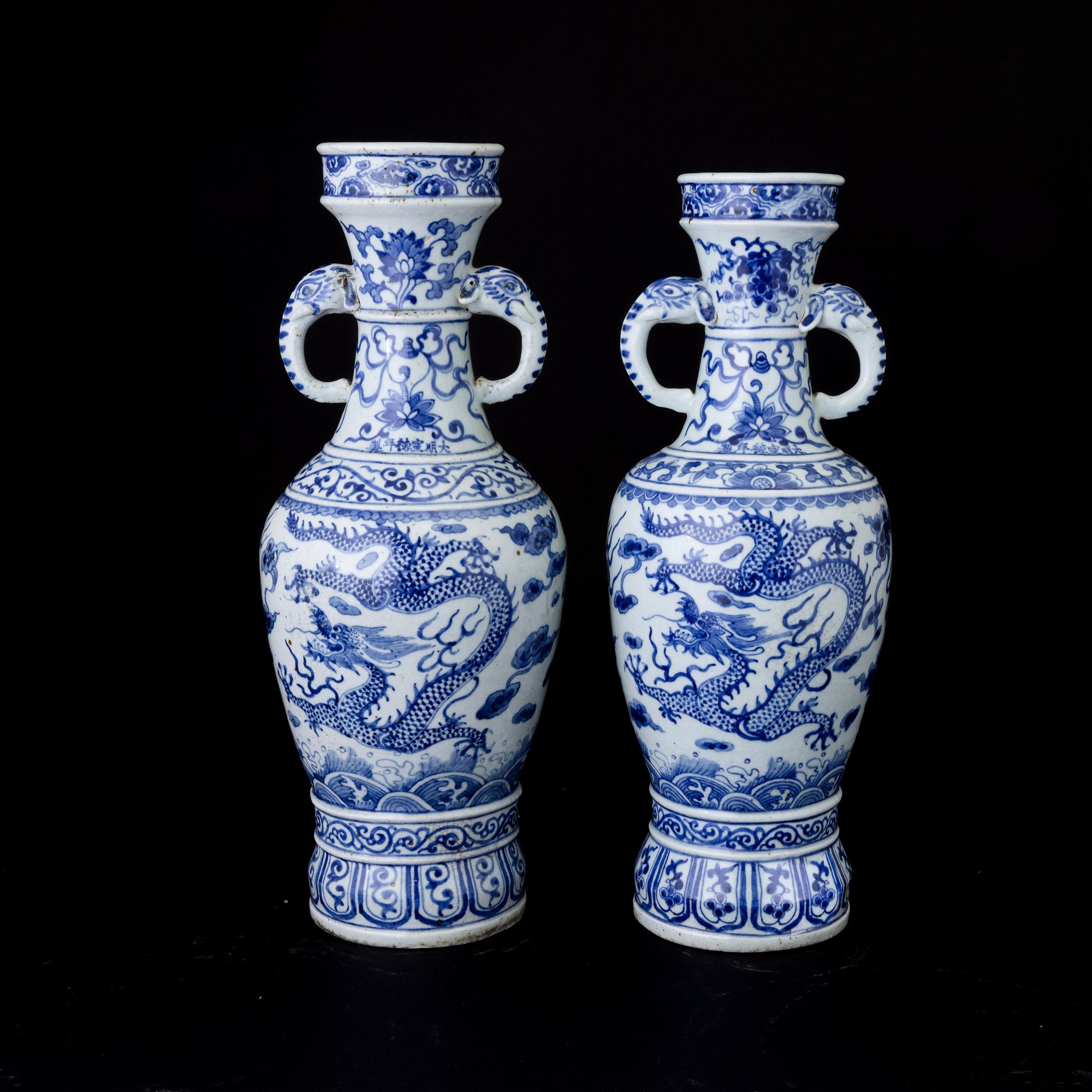 Coppia di vasi biansati in porcellana bianca e blu raffiguranti draghi a decoro floreale, Cina, Dinastia Qing, XIX secolo [..]