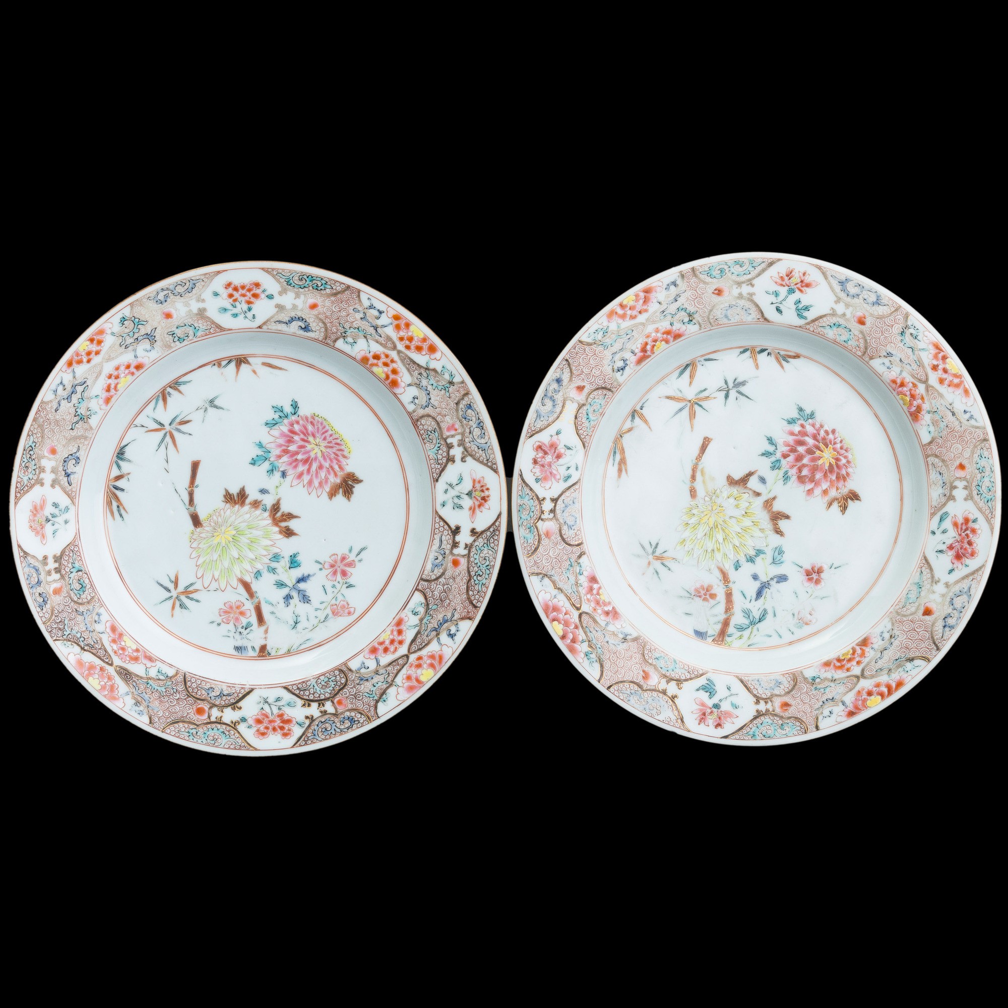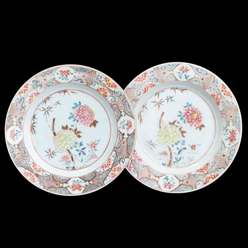 Due piatti in porcellana Famiglia Rosa con peonie, Cina, Dinastia Qing, XVIII secolo