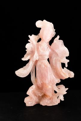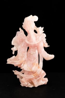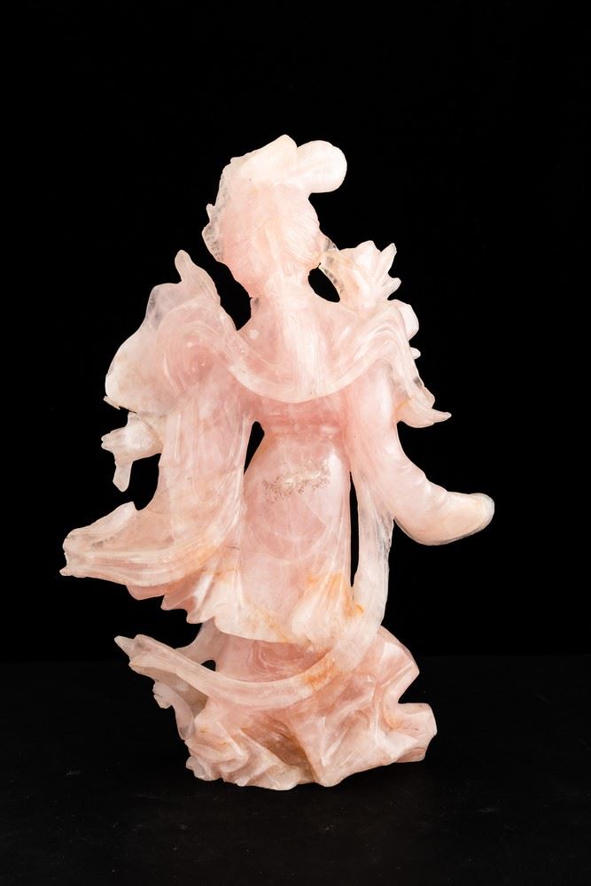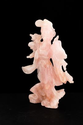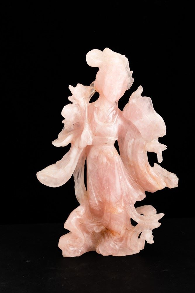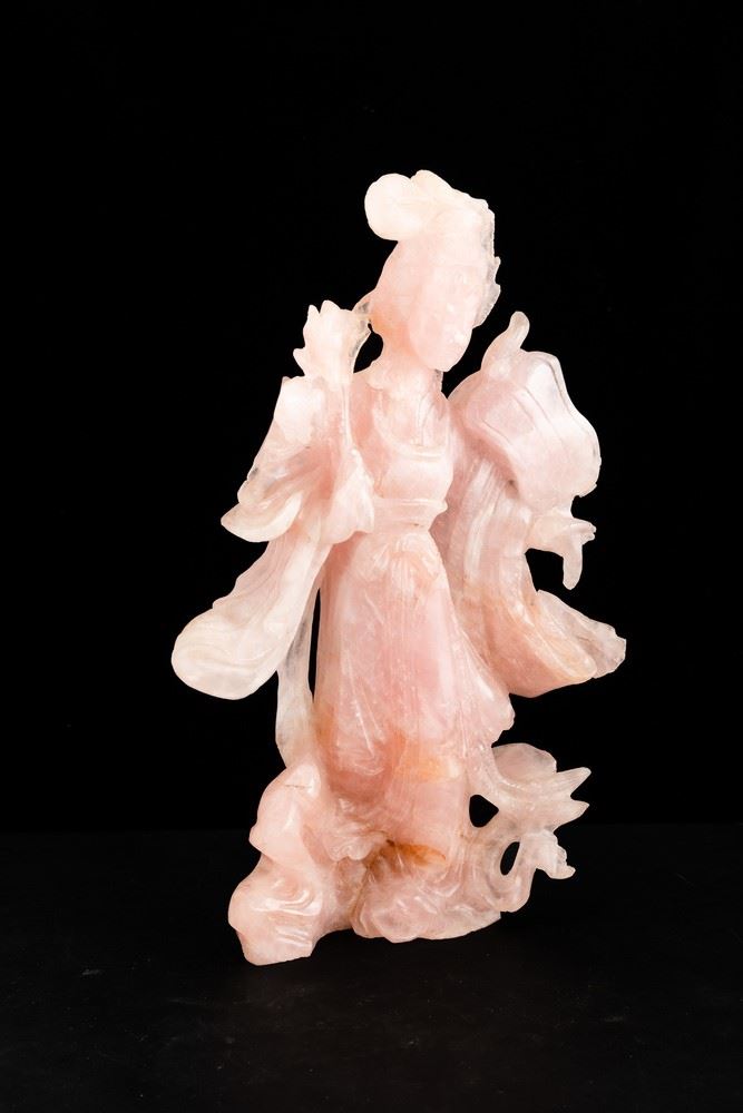 Figura di fanciulla con fiore scolpita in quarzo rosa, Cina, Dinastia Qing, XX