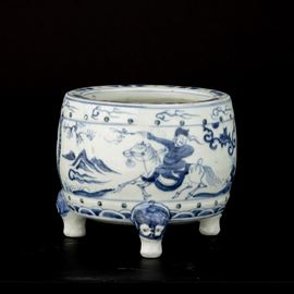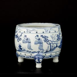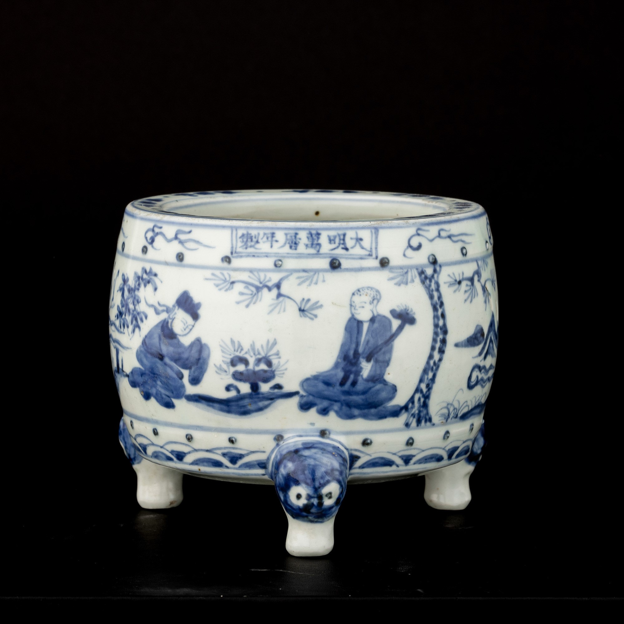 Incensiere in porcellana bianca e blu raffigurante scena di vita comune, Cina, XX secolo