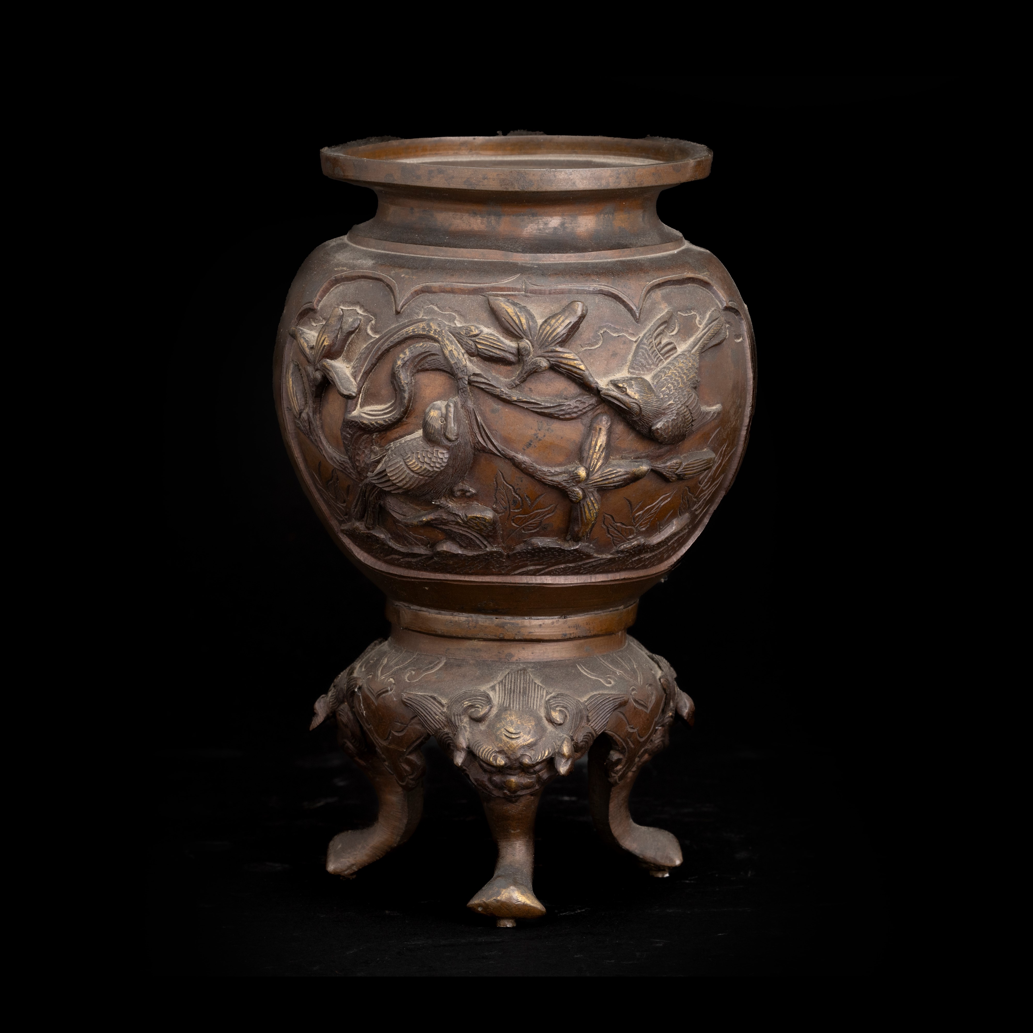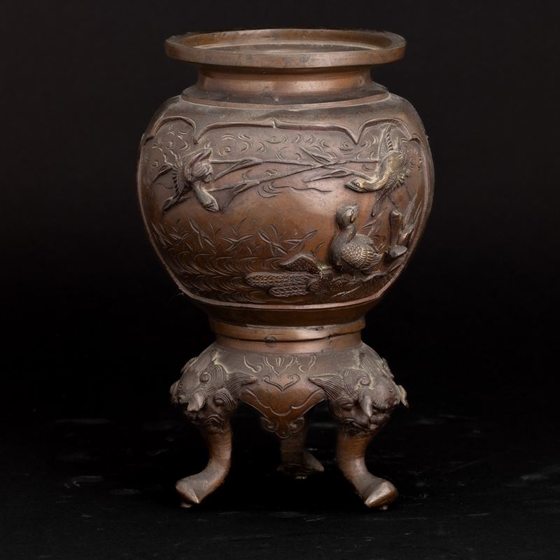 Incensiere tripode in bronzo raffigurante scena di paesaggio con uccelli a rilievo, Giappone, periodo Meiji (1868-1912)