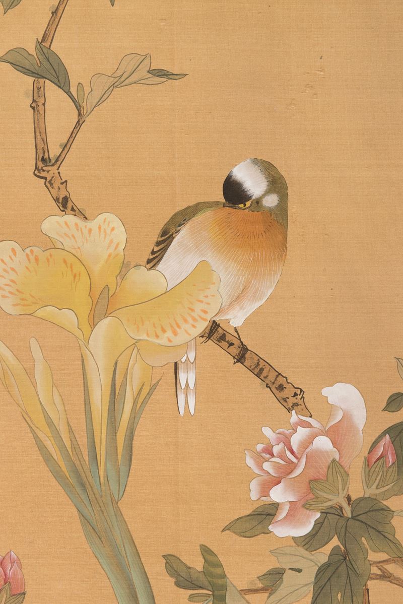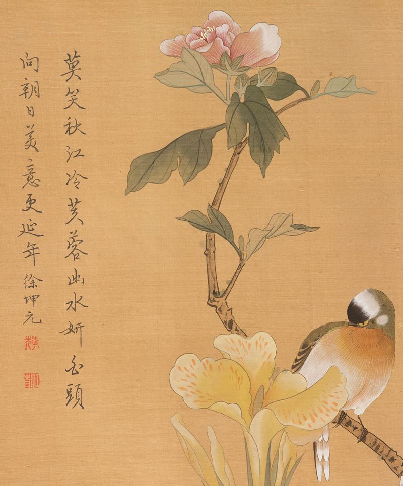 Scroll with inscriptions, flowers and bird on branch with box, Xu Kun Yuan, China, 20th century