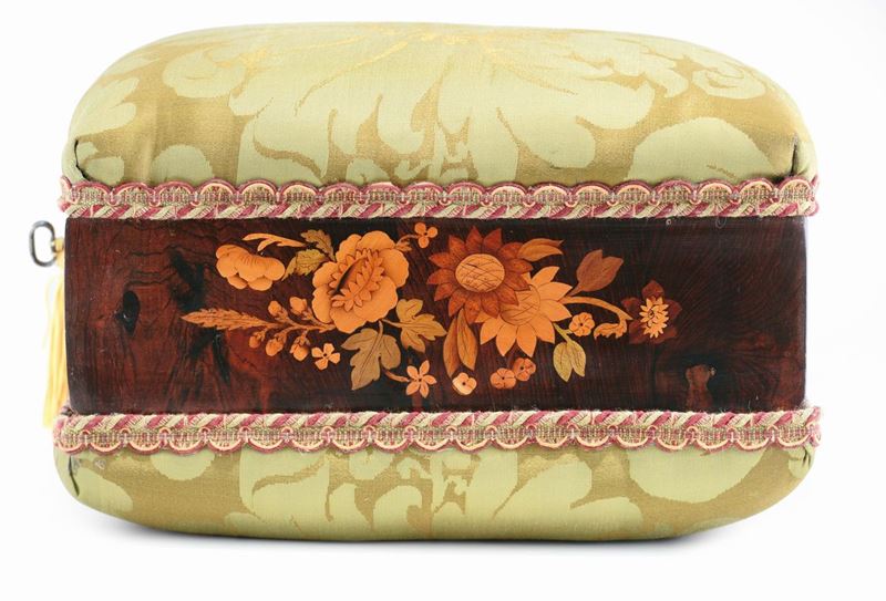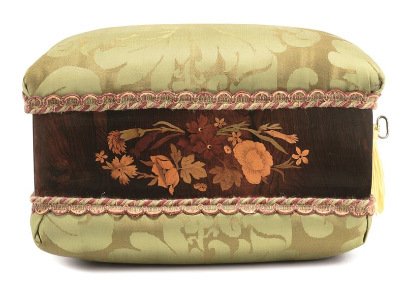 A workbox with a structure in poplar wood, with a walnut veneering and carved floral motives in various essences. Workshop [..]