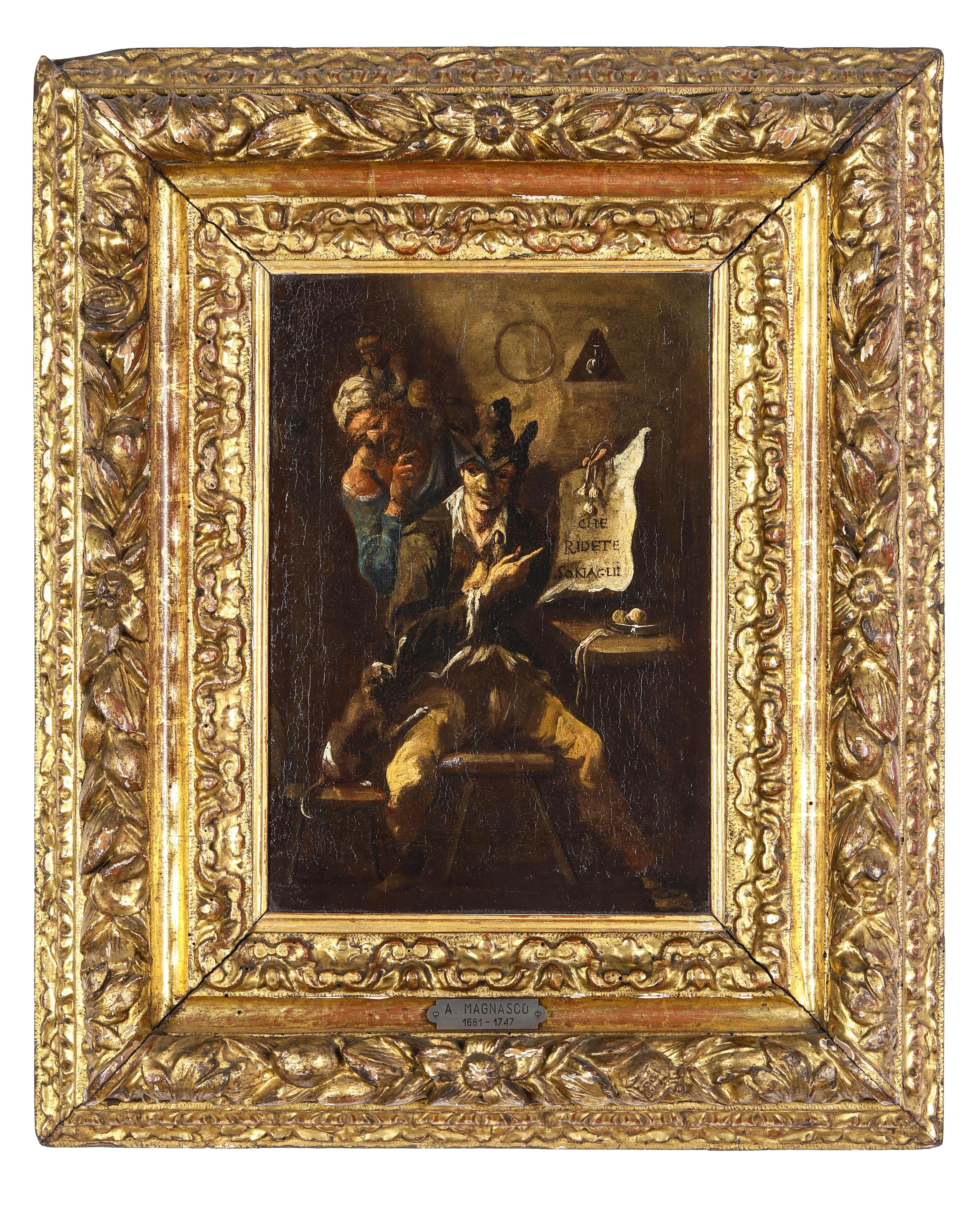 Quest’opera singolare e densa di spirito satirico è un esempio paradigmatico della produzione di Alessandro Magnasco, artista genovese celebre per il suo linguaggio pittorico visionario e anticonvenzionale. In Che ridete son agli – frase scritta su un cartiglio in primo piano, che funge da titolo ironico – l’artista mette in scena un bizzarro personaggio grottesco, probabilmente un ciarlatano o un alchimista, colto in un gesto teatrale e circondato da oggetti enigmatici.