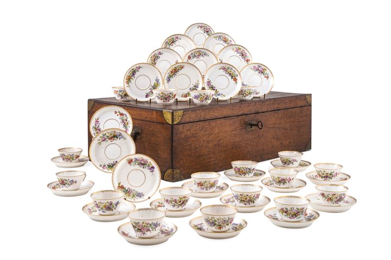 Cinquantaquattro tazze con piattino in cassetta di legno con stemma sabaudo e placchetta sul bordo con la scritta “Manuf.re Barre - Pin Rue de Lisbonne 32 Paris”.