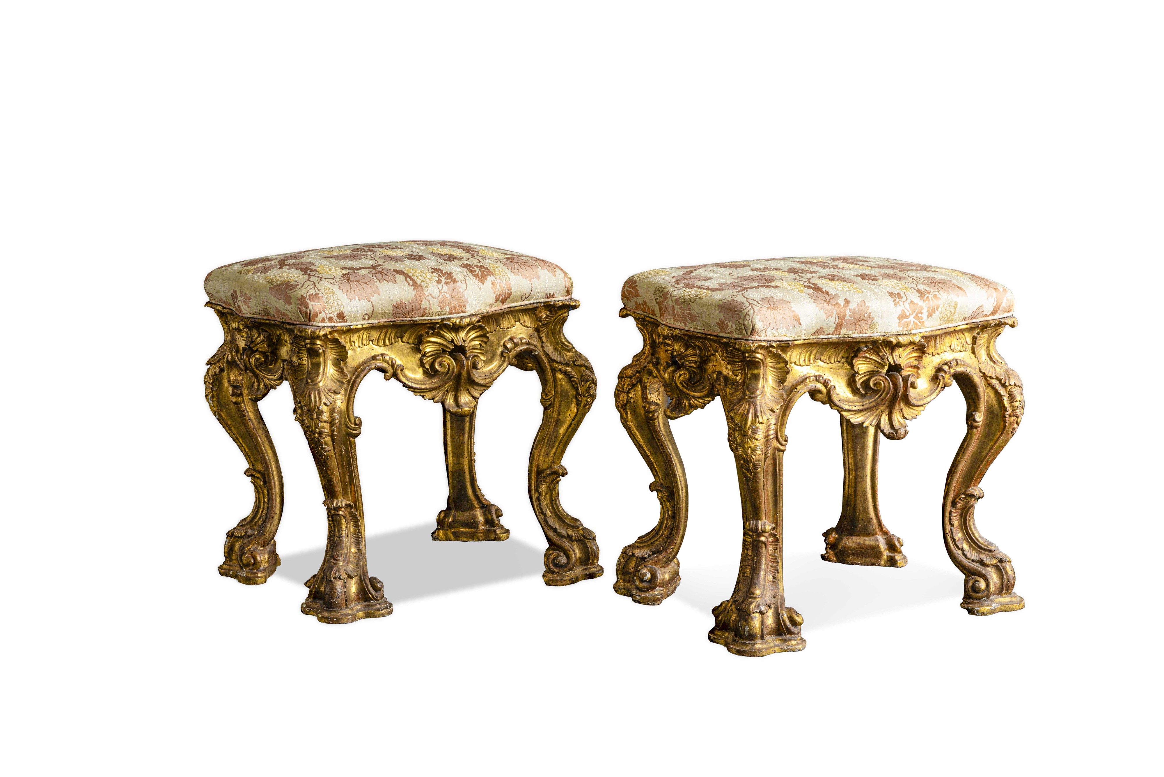 Legno intagliato e dorato. Di forma marcatamente mossa, caratterizzati da ricchi intagli profondi dalle linee audaci, decorati con pellacce, elementi fitomorfi e volute dalle forme accentuate e dal carattere dinamico. Piedi a ricciolo.