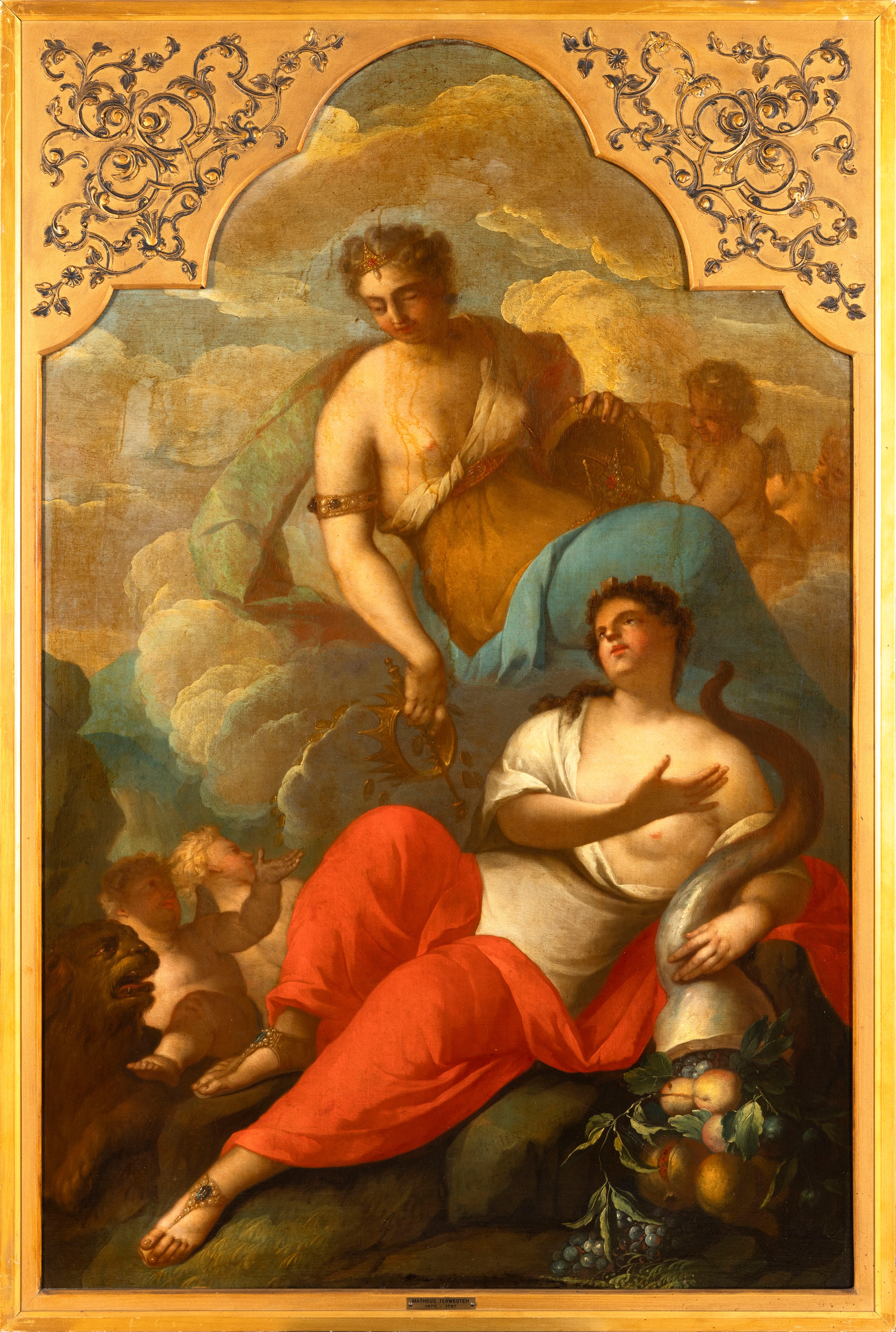 Questa coppia di raffinati dipinti allegorici sono opera di Mattheus Terwesten, esponente del tardo barocco olandese, formatosi nei Paesi Bassi e successivamente attivo a Berlino, fu uno dei principali pittori della corte prussiana. Le due composizioni, ricche di pathos teatrale e suggestioni mitologiche, mostrano figure femminili idealizzate, amorini, attributi simbolici (come il corno dell’abbondanza, il serpente e la coppa) e un sapiente uso delle nuvole e della luce per suggerire ambientazioni divine o allegoriche. L’equilibrio tra l’idealismo classico e la ricchezza decorativa è pienamente rappresentativo del gusto internazionale del tempo.