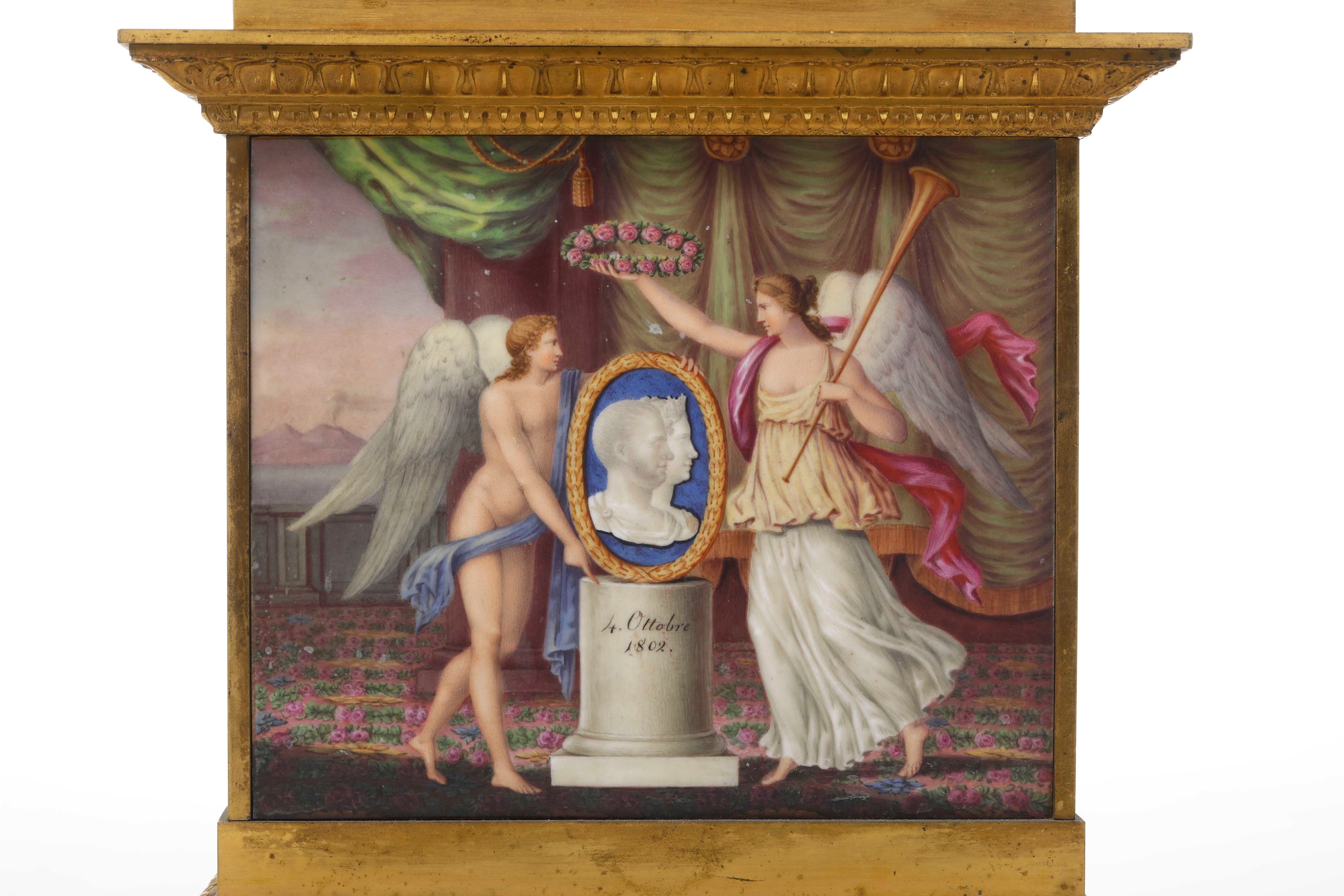 Cassa di forma architettonica in bronzo dorato, quadrante decorato da scena mitologica a rilievo, cartouches in bronzo con numerazione romana per le ore, alternate a segni zodiacali in rilievo. Placca frontale dipinta in policromia con figure alate che incoronano un medaglione con profili, a commemorazione delle nozze tra Francesco I di Borbone e Maria Isabella di Spagna, celebrate il 4 Ottobre 1802. Placca probabilmente francese dipinta da uno dei numerosi pittori attivi all'epoca nel Regno delle Due Sicilie.