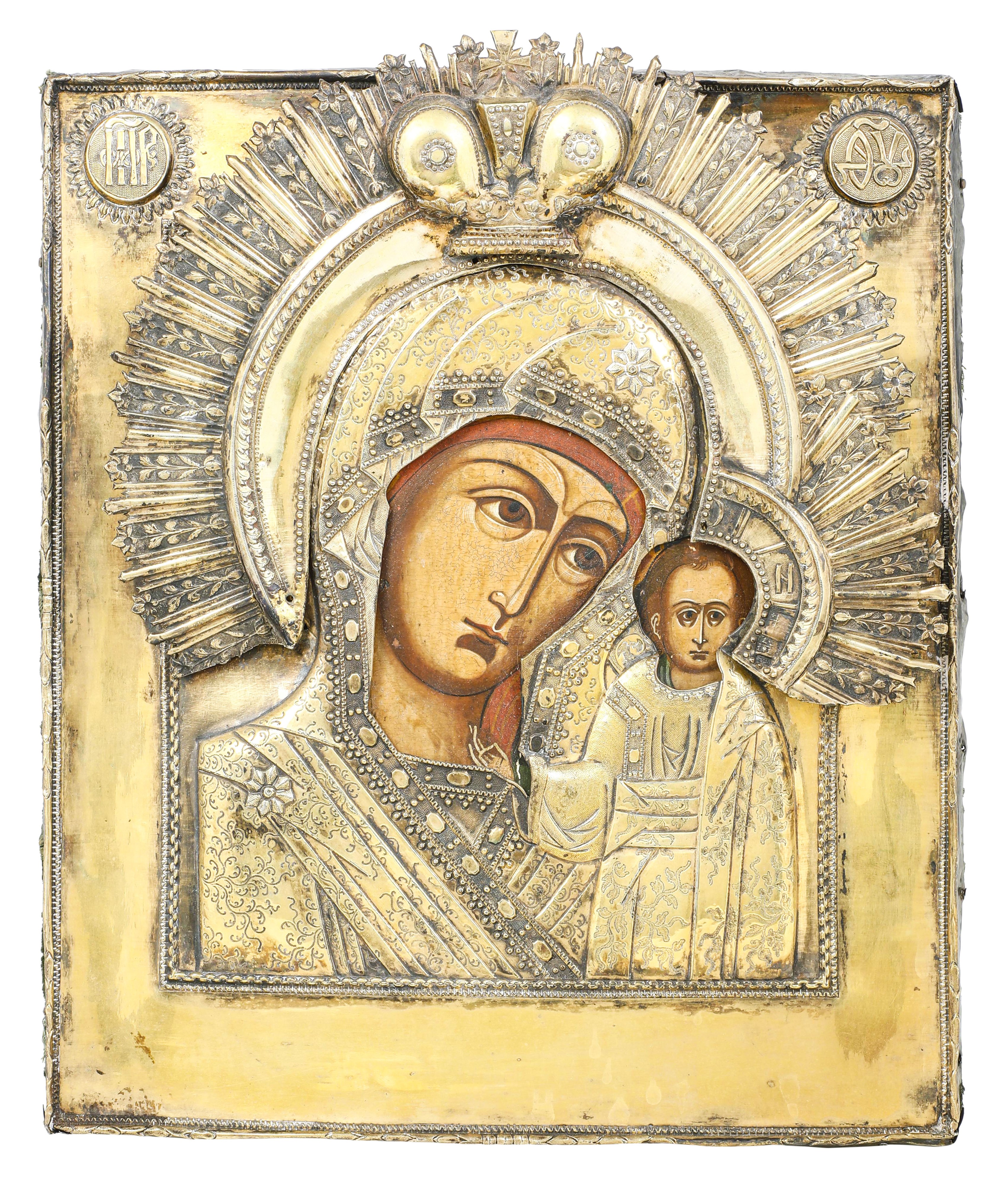 Riza in argento fuso, sbalzato, cesellato e dorato. Russia (città di Galic?) 1775. Marchi del saggiatore e dell'argentiere (non identificati) Deipara di Kazan