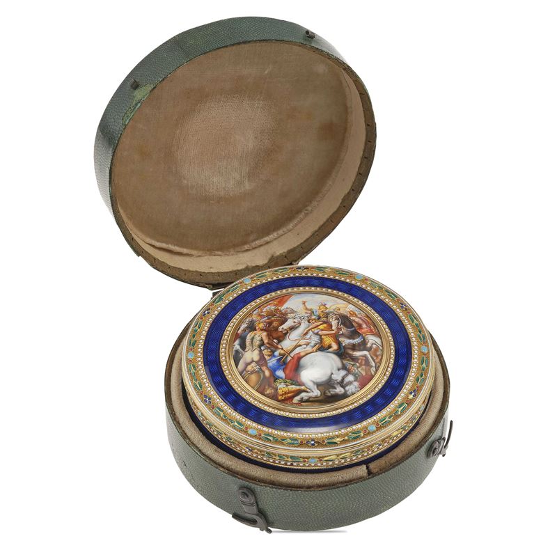Scatola in oro, guilloché, attribuibile a Jean-Joseph Barrière (documentato fra il 1763 e il 1793), con miniatura in smalti [..]