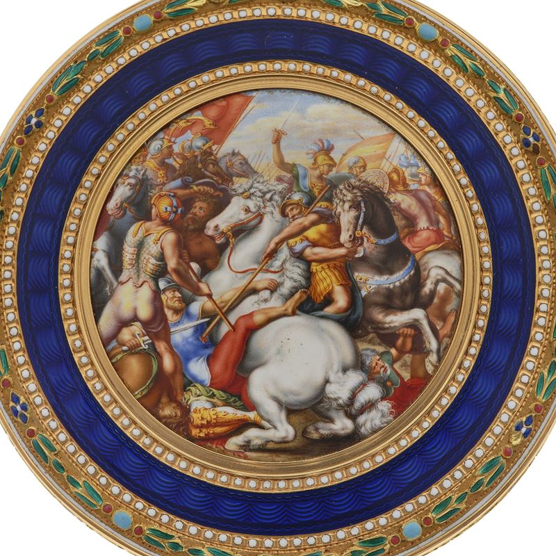 La miniatura, firmata Robert Vauquer (1625 - 1670) raffigura un dettaglio dall’affresco "La battaglia di Ponte Milvio" realizzato negli anni 1520-1524 da Giulio Romano, allievo di Raffaello, nella Sala di Costantino (Musei Vaticani, Roma).