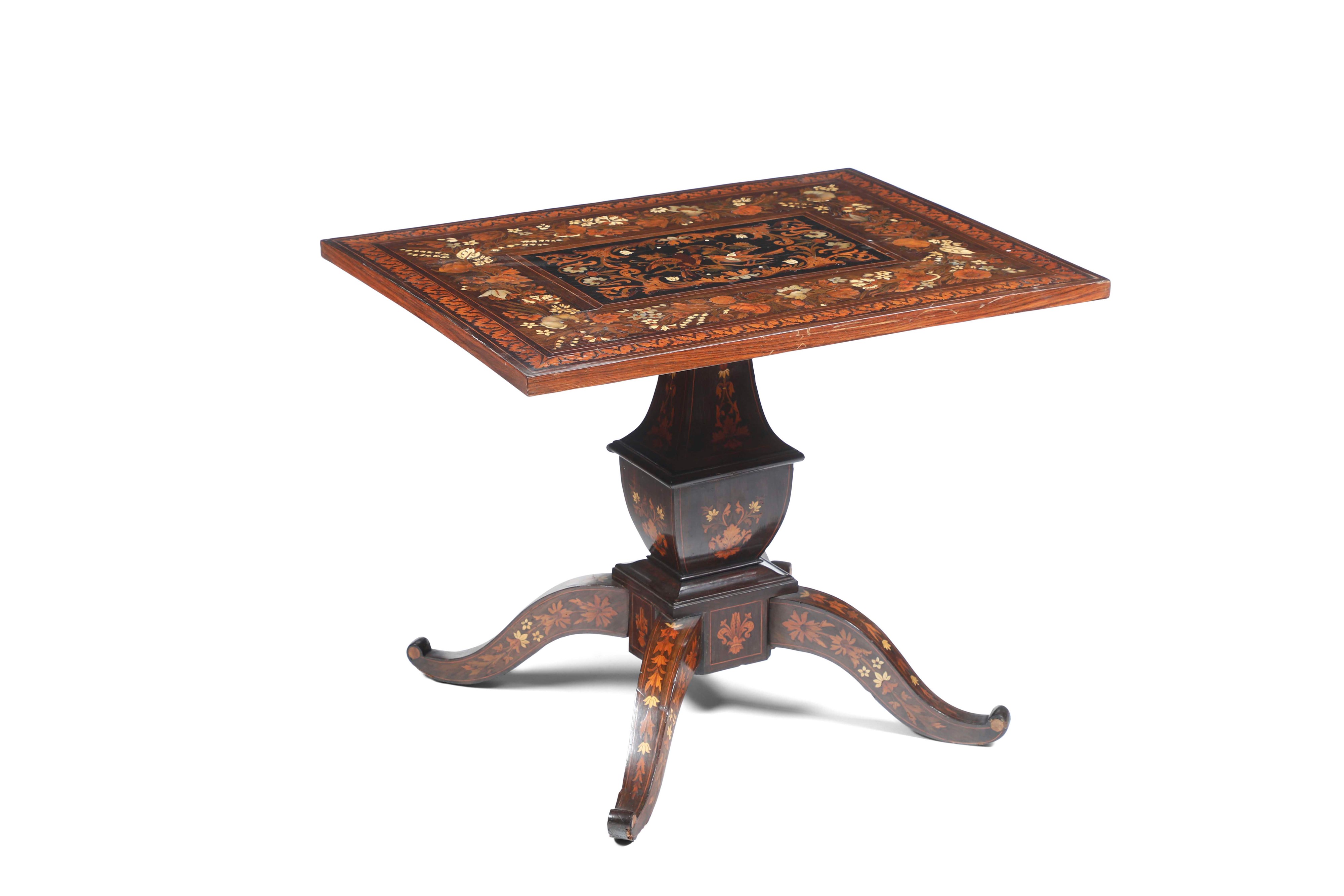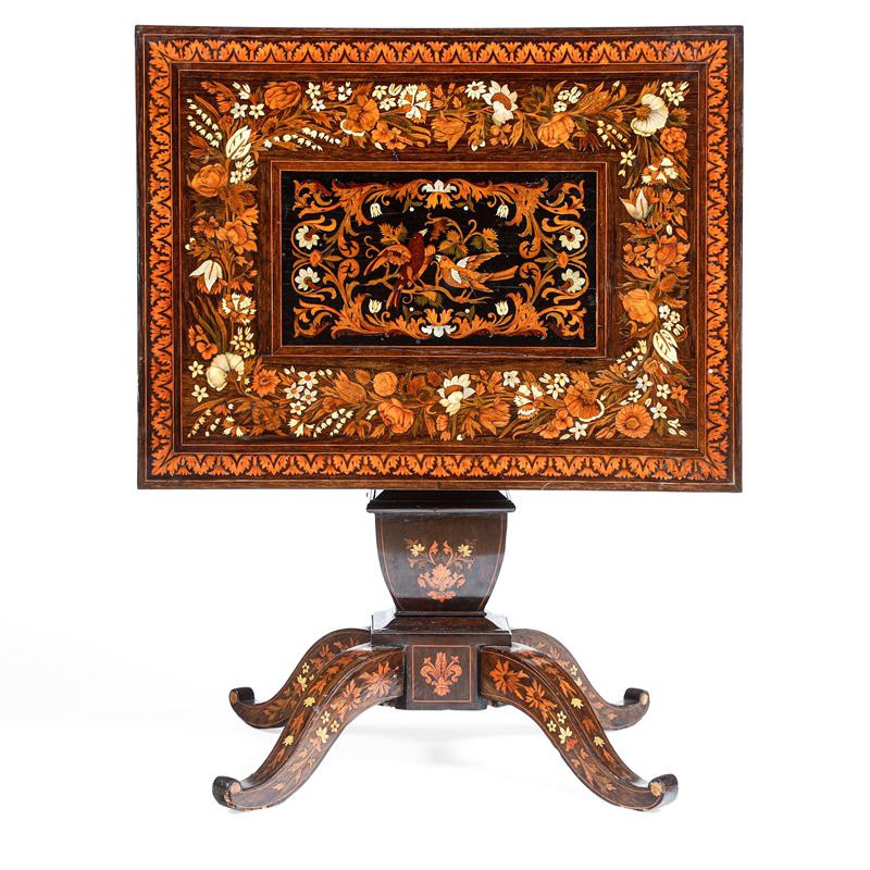 Piano ribaltabile lastronato in palissandro, filettato e intarsiato in bois de rose, legno tinto, avorio, madreperla e legni vari, riccamente decorato con tripla bordura di ghirlanda floreale e girali fogliate che incorniciano due volatili su un tralcio di vite entro riserva ebanizzata. Gamba a balaustro, piedi mossi terminanti a ricciolo. Sul sostegno centrale campeggia intarsio con giglio di Firenze.