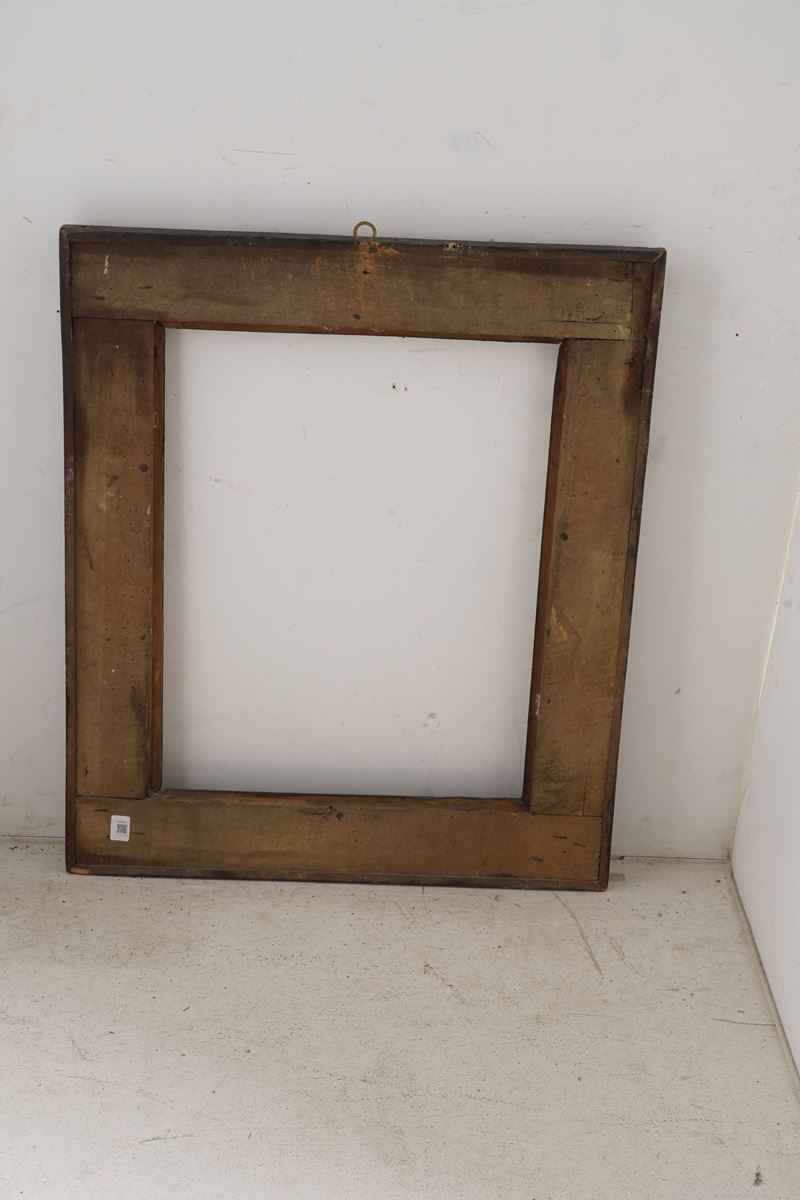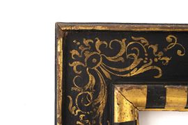 battuta liscia su profilo aggettante ornato a riquadri in nero e oro alternati che con ampia gola scende su sagoma a cassetta ornata da ramages vegetali ai centri e agli angoli