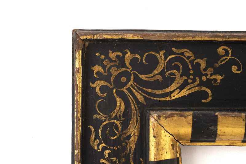 Cornice a cassetta in legno ebanizzato con decori in oro. Toscana, XVI-XVII secolo