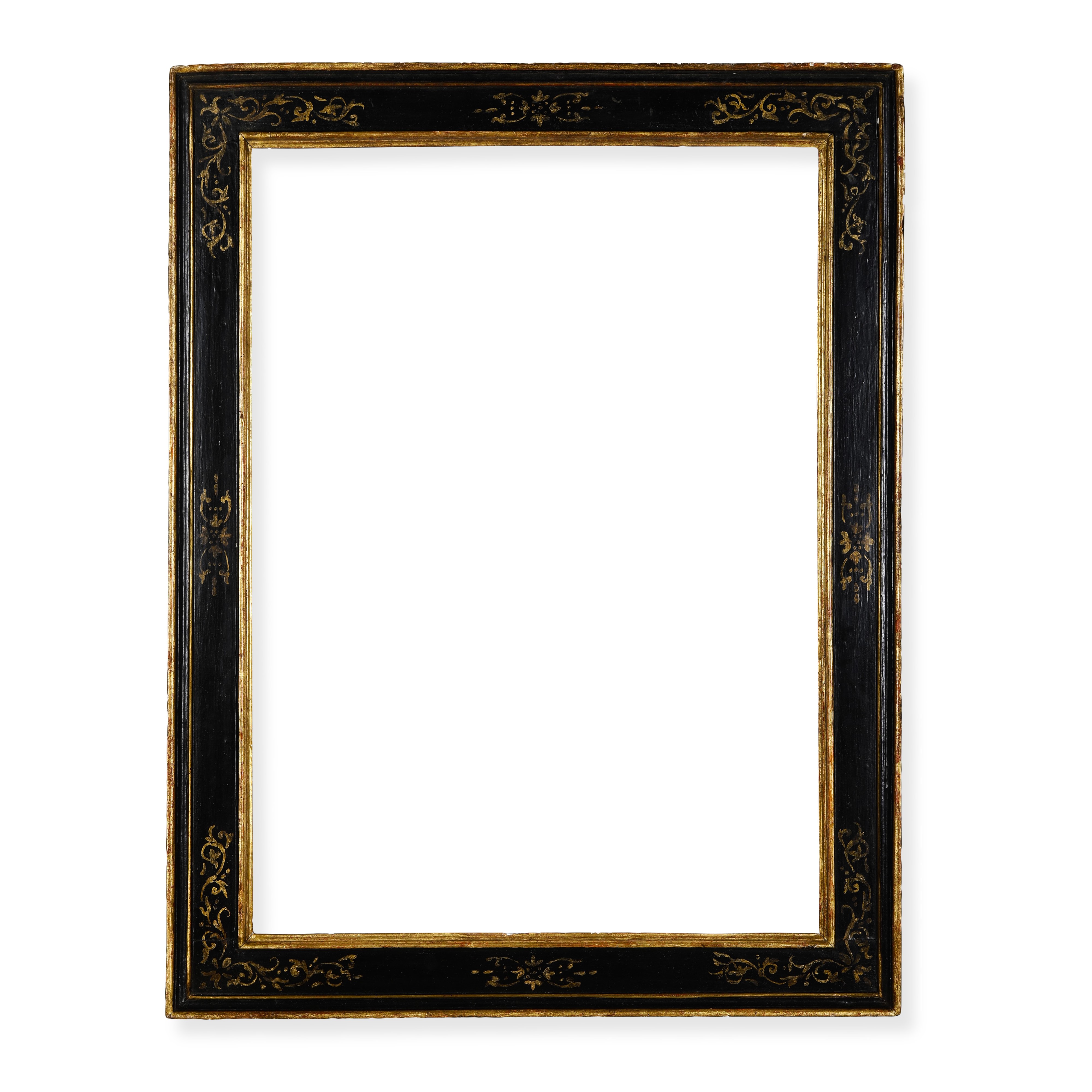 battuta dorata si apre in più ordini di modanatura su sagoma a cassetta con decori a ramages agli angoli e ai centri; profilo dorato