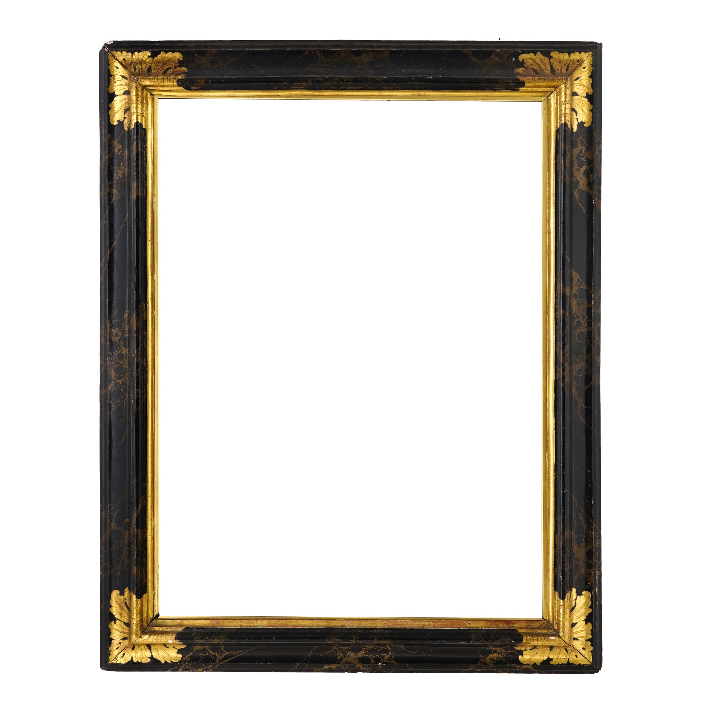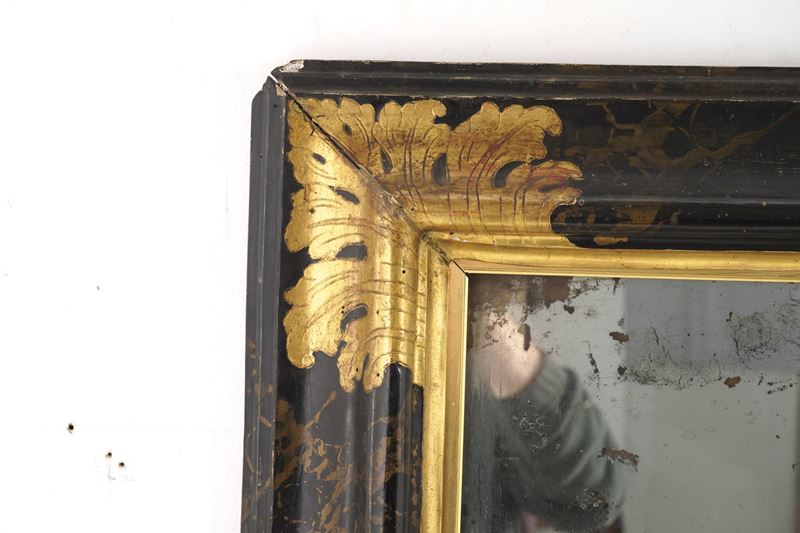 Cornice con specchio in legno laccato nero a finto marmo. Italia centrale XVIII secolo