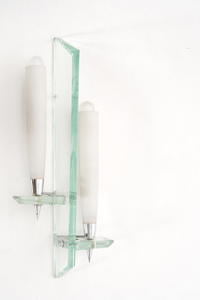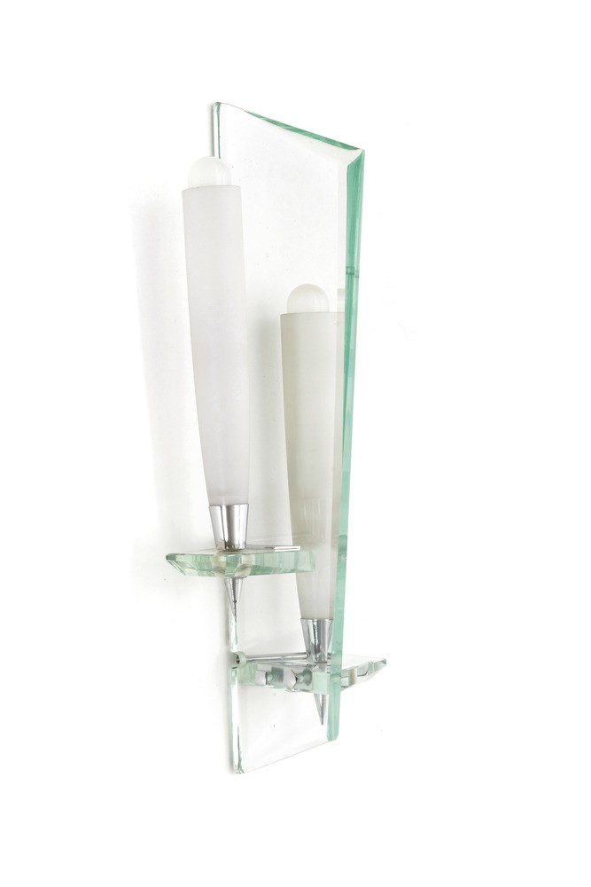 Struttura in cristallo molato e acciaio. Diffusori in vetro satinato.