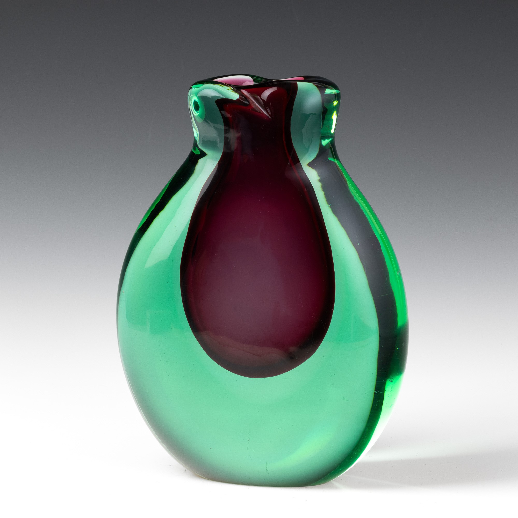 Oval section vase with uneven mouth in two-colour sommerso glass.