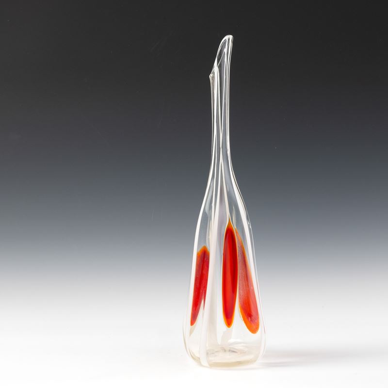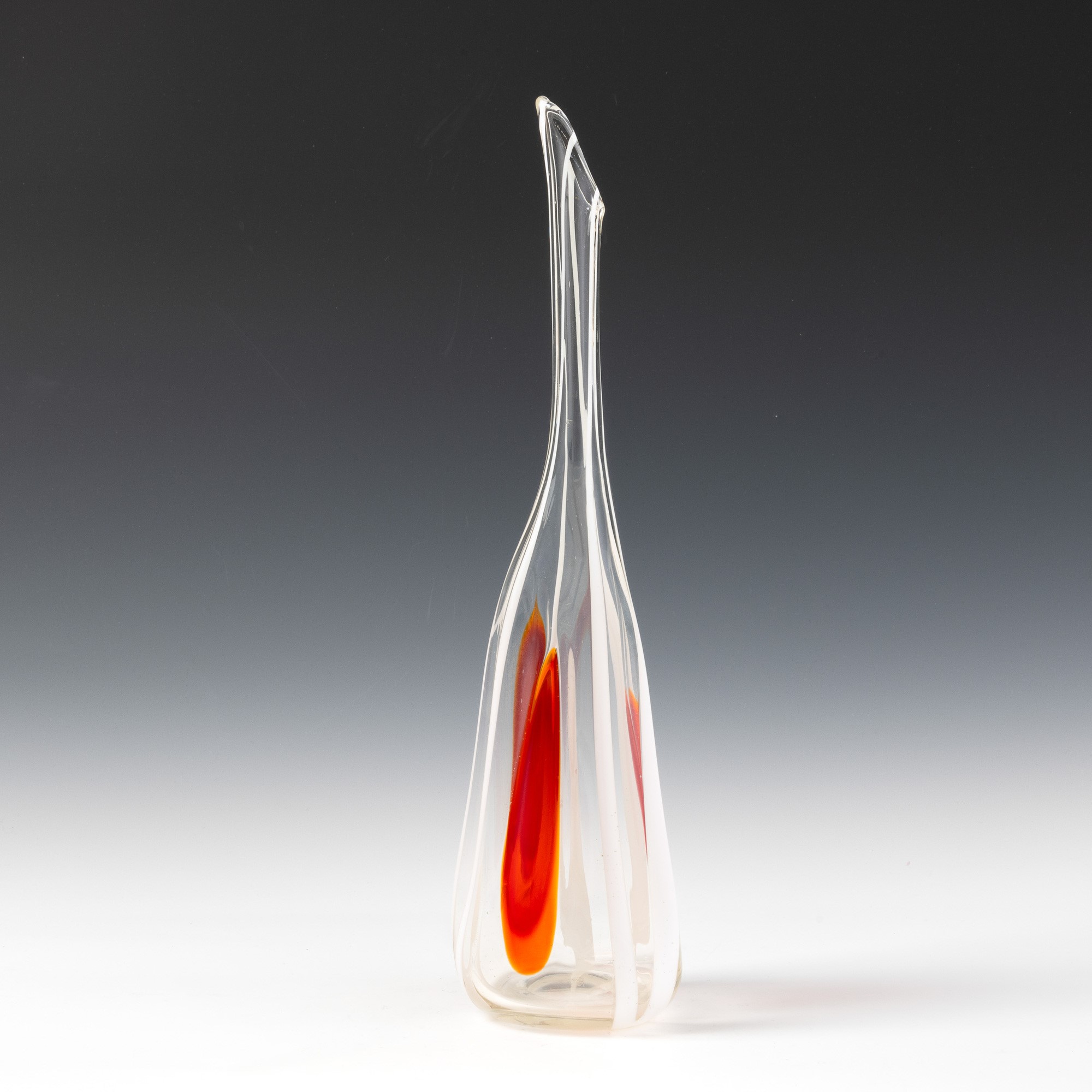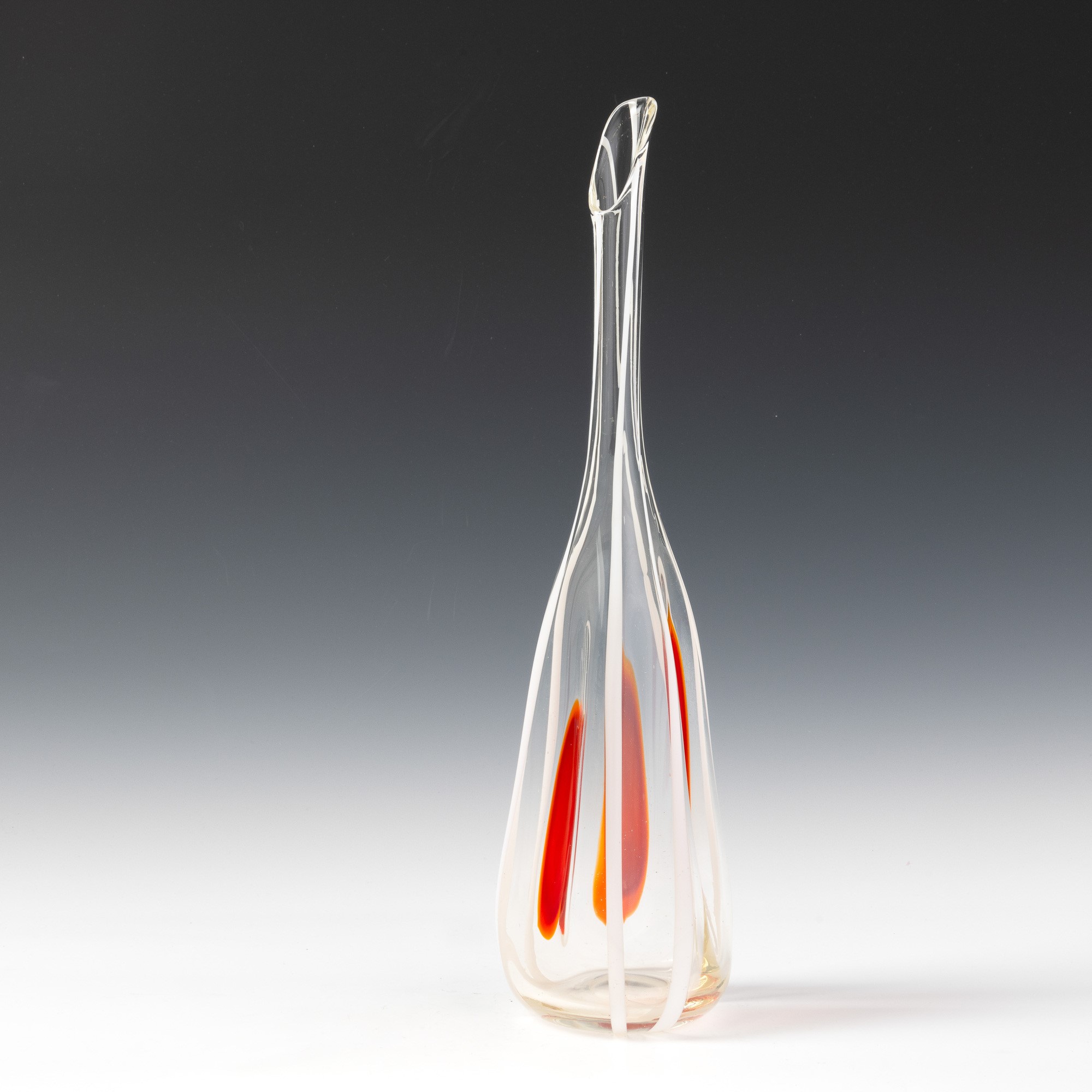 Bottle vase in blown glass with red decorations and applied 'lattimo' (milky) strands.