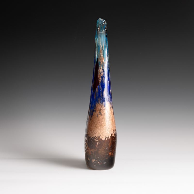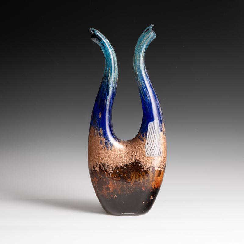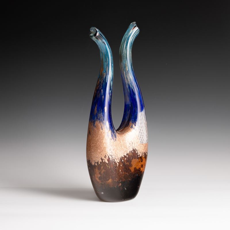 Rare Eldorado series vase in the shape of a lyre with two mouths in blown glass decorated with sommerso polychrome powders, aventurine and large star murrine.