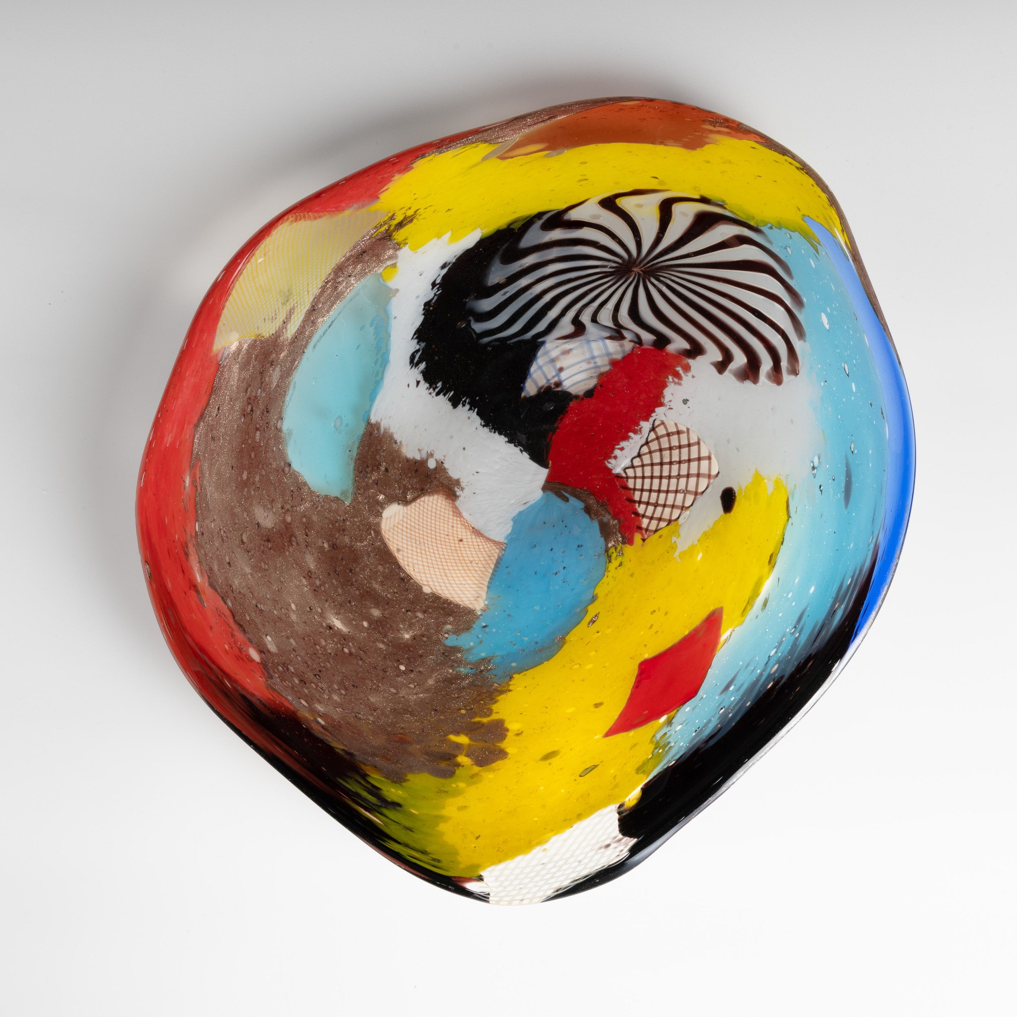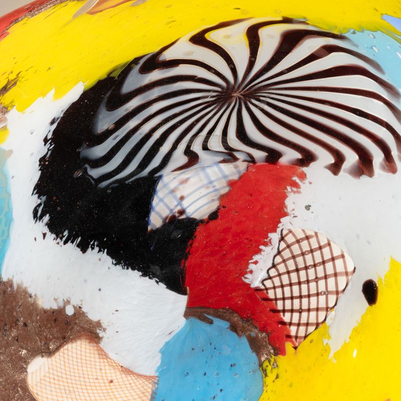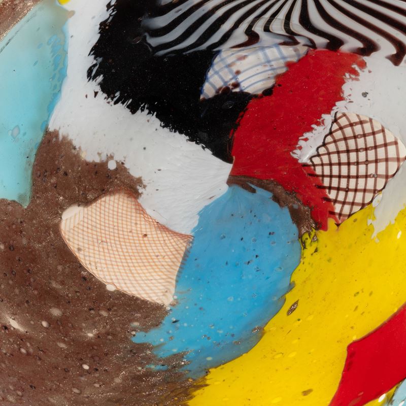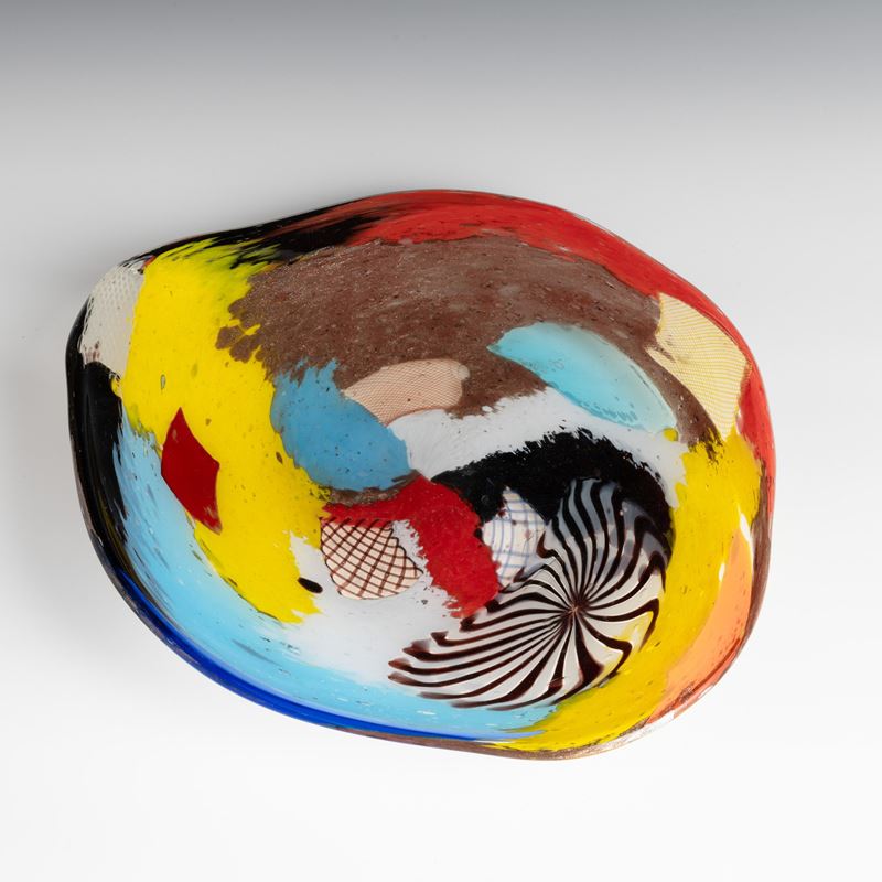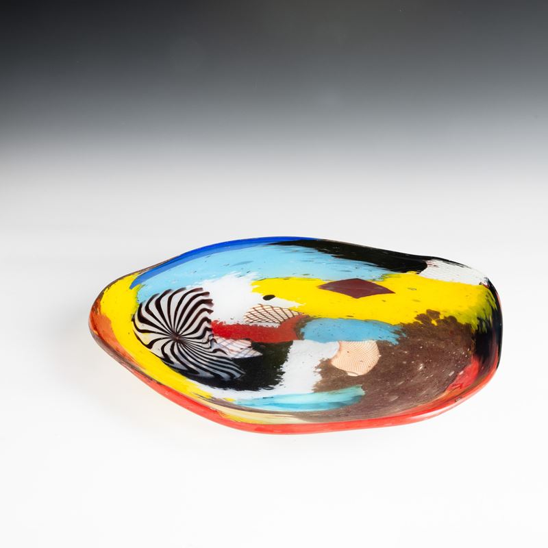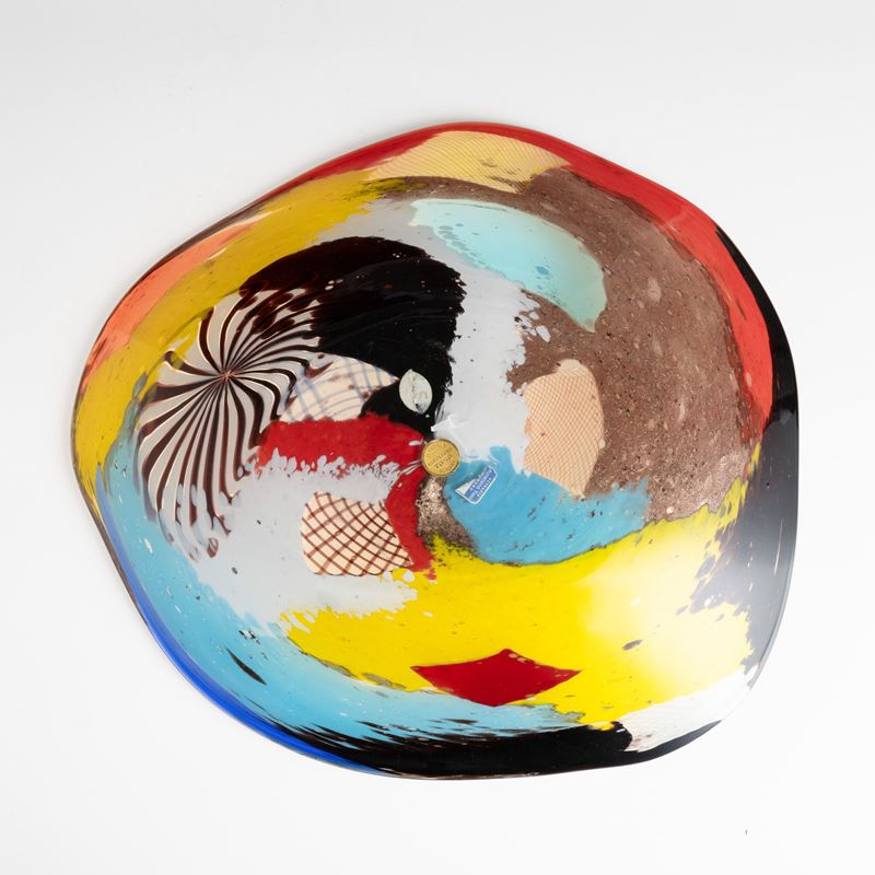 Rare Oriente series pentagonal dish decorated with large polychrome marks, aventurine, 'zanfirico' canes and star murrine. Old labels.