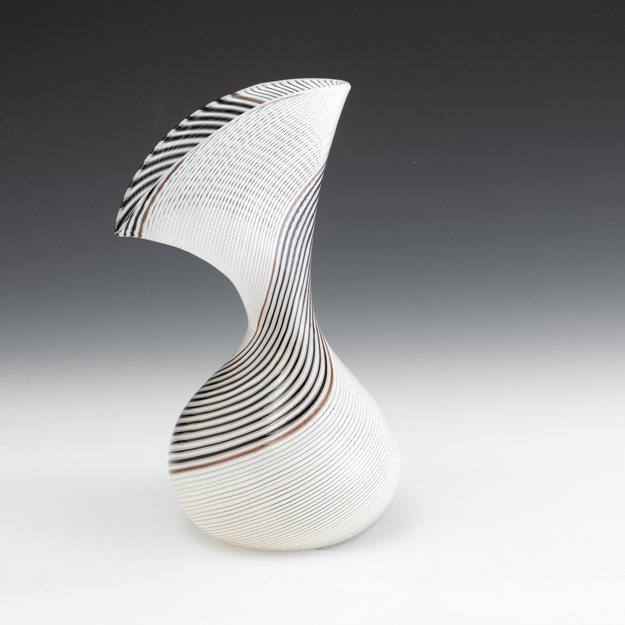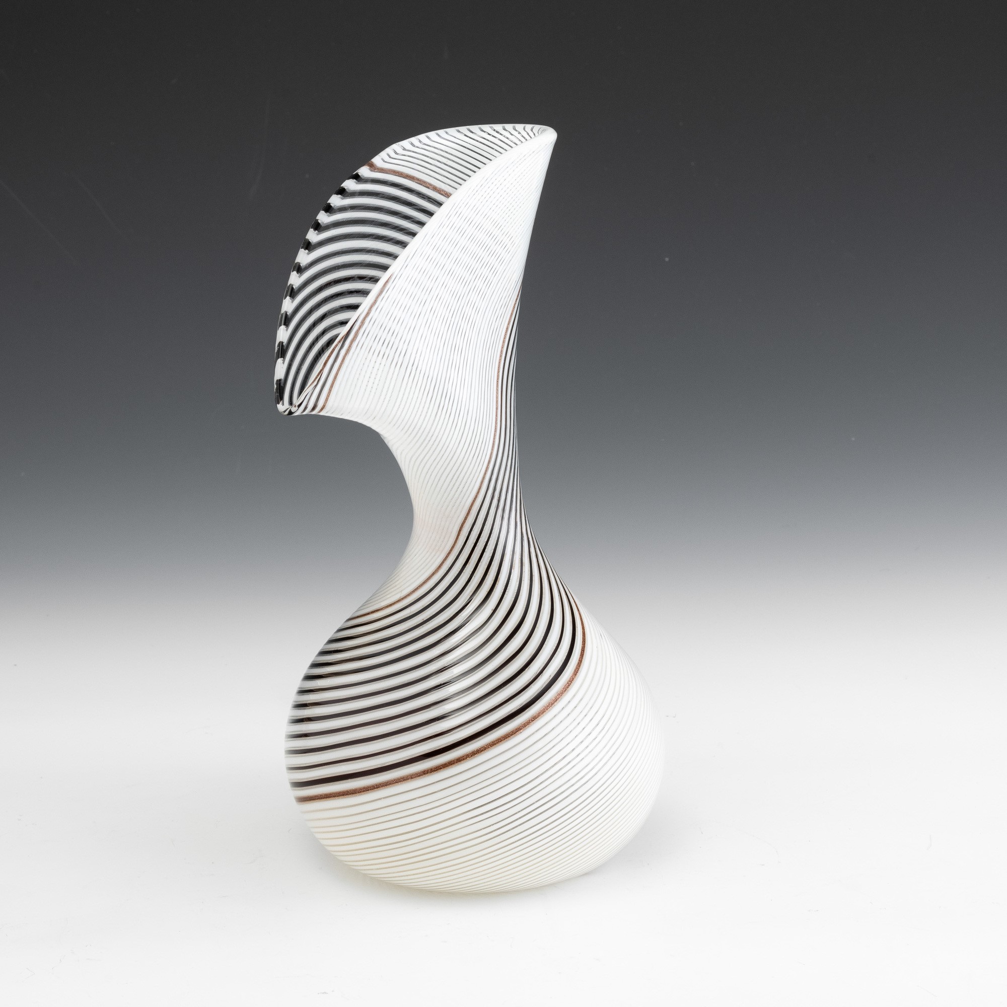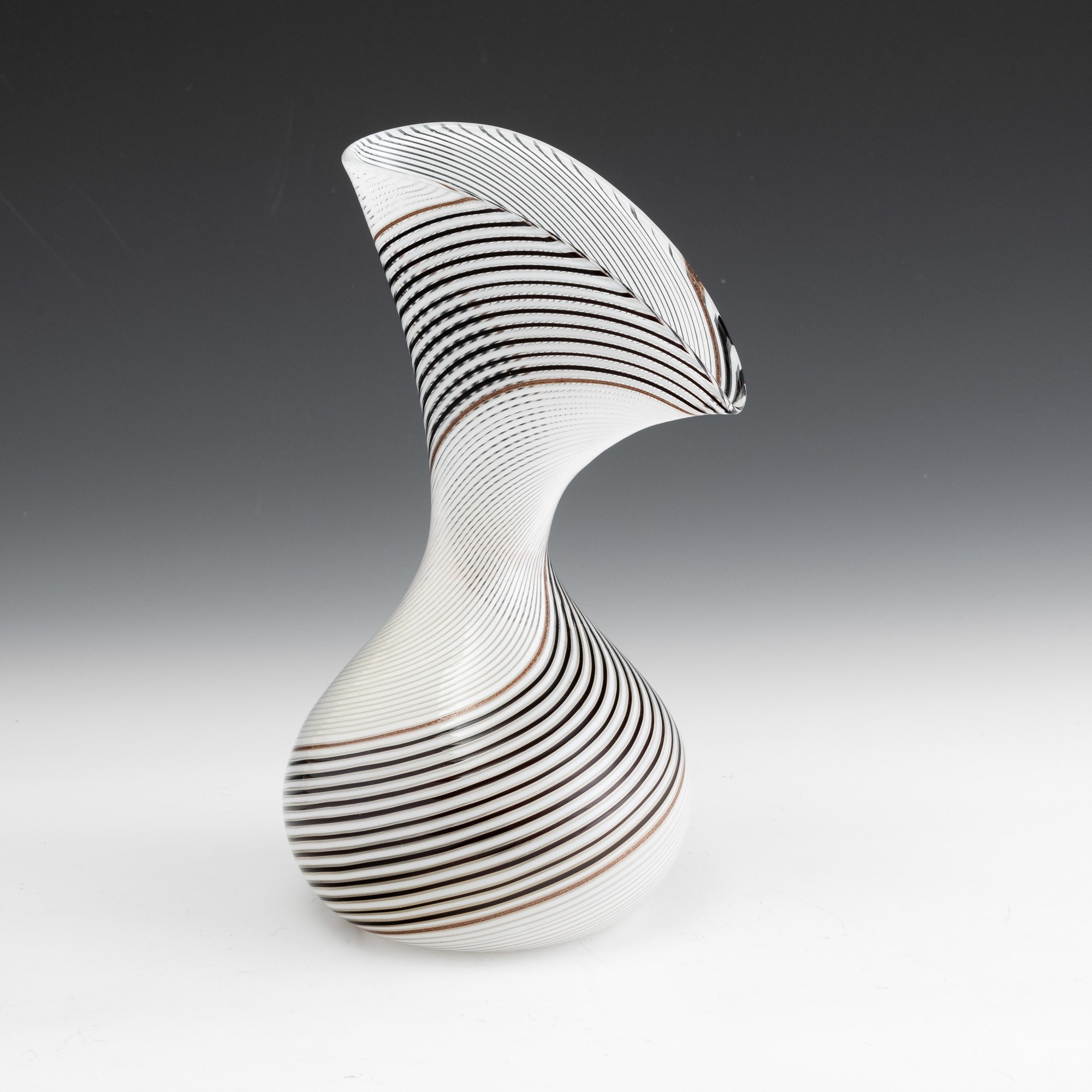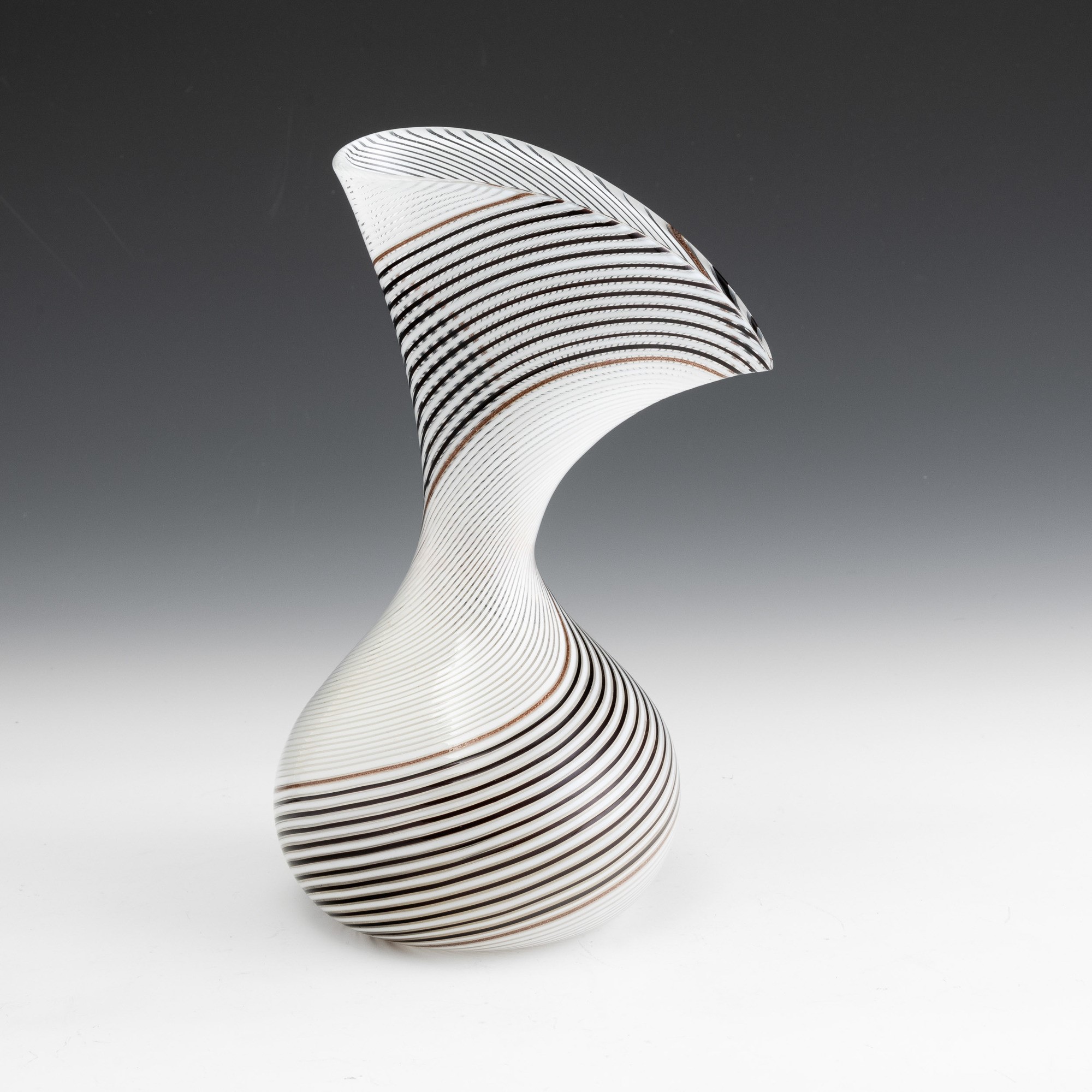 Rare blown glass vase with large fan neck and aventurine, 'lattimo' (milky) and black spiral cane decoration.