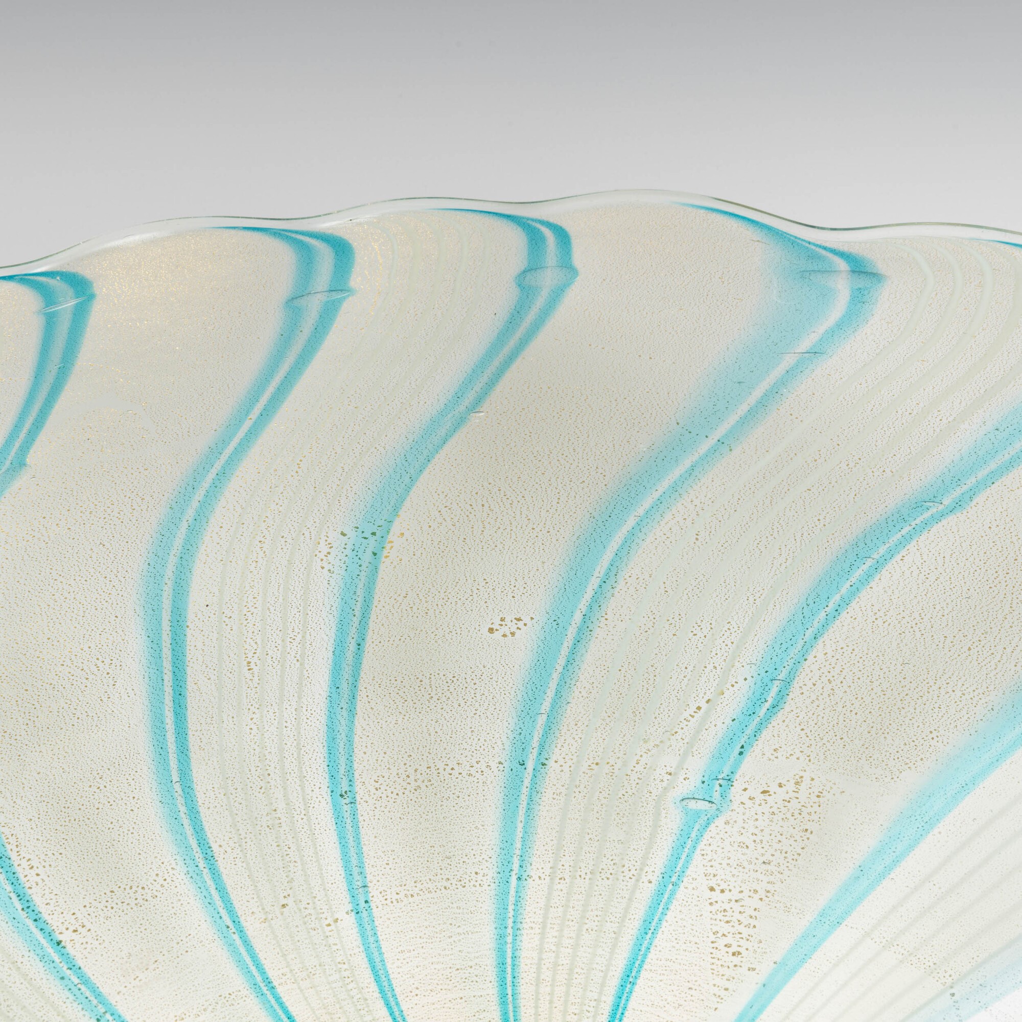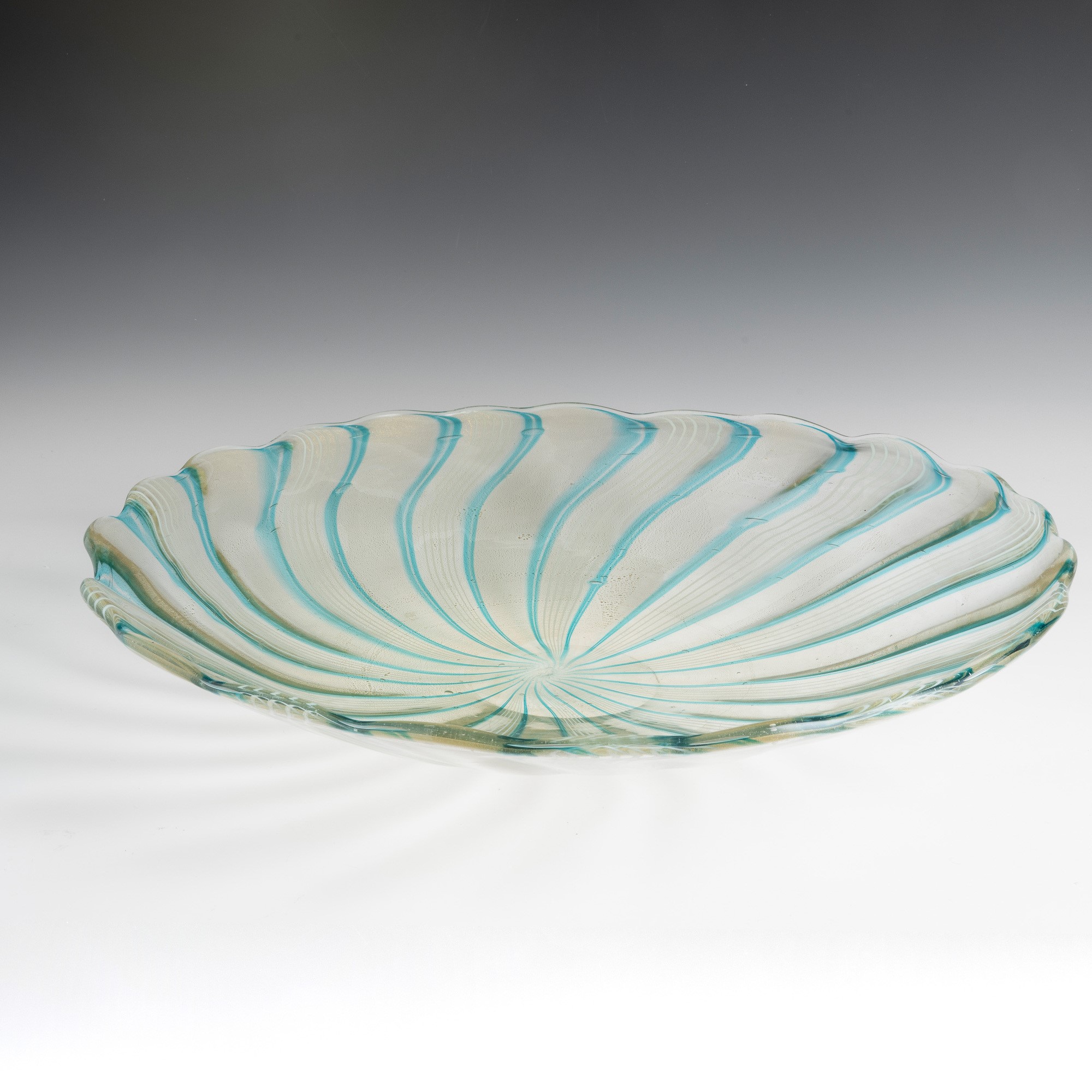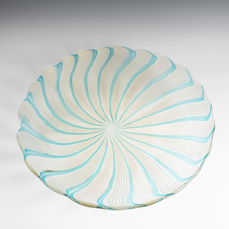 Large Corinto series centrepiece in blown glass decorated with concentric spiral canes in green and 'lattimo' (milky) glass with gold leaf inclusion.