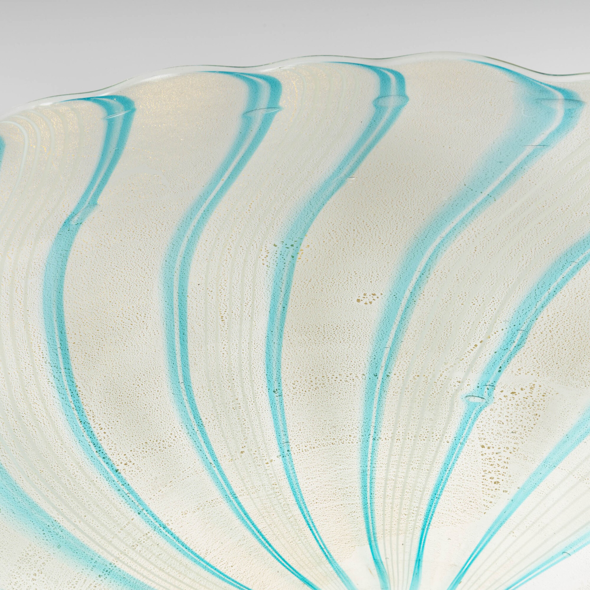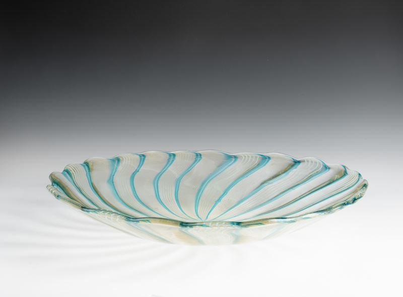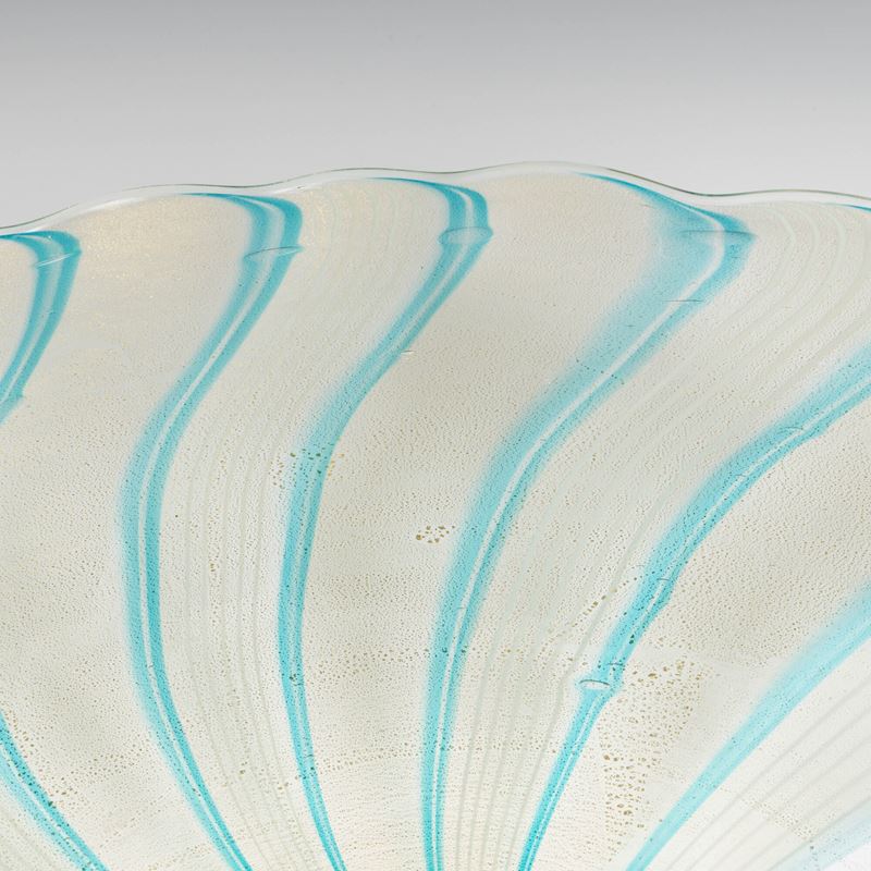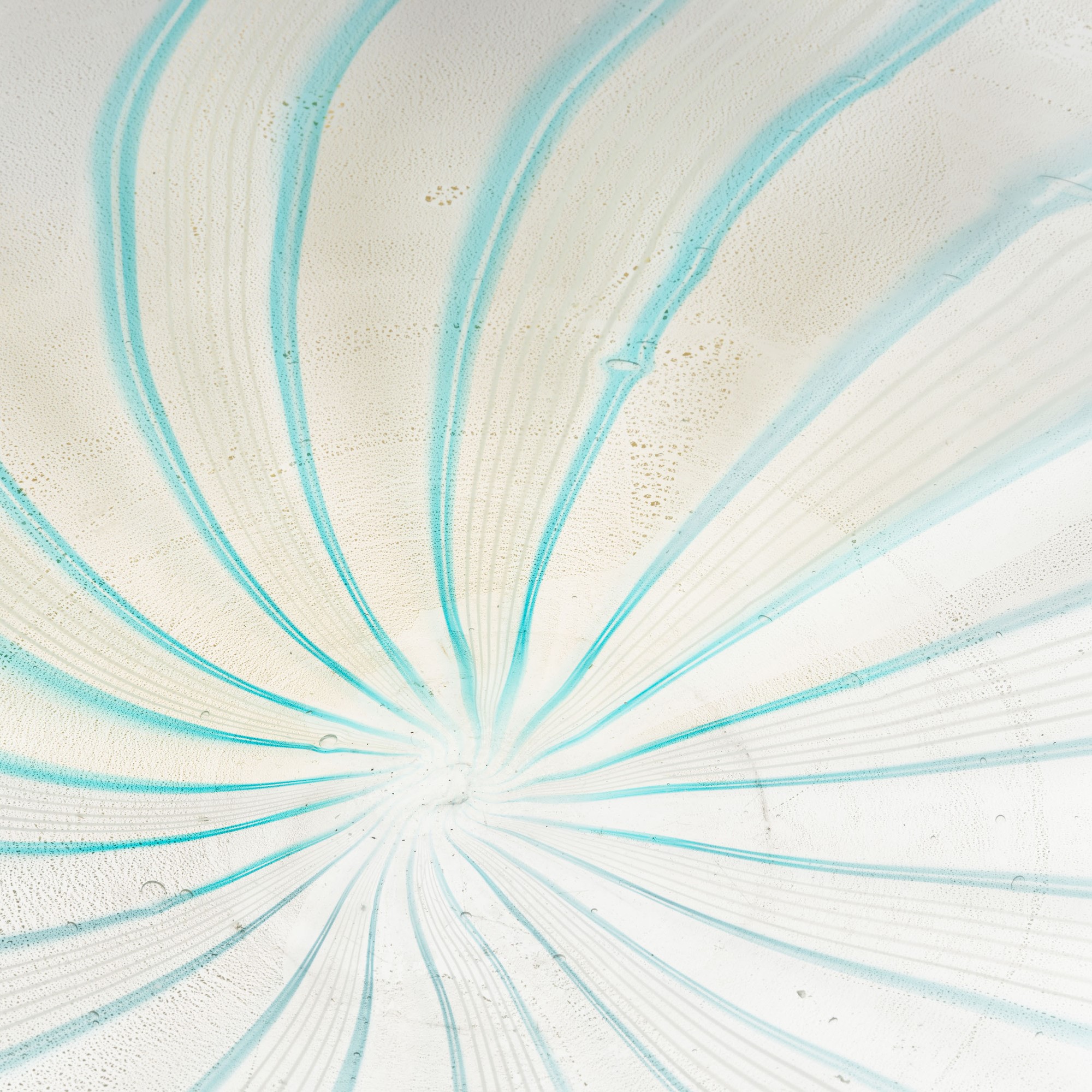 Large Corinto series centrepiece in blown glass decorated with concentric spiral canes in green and 'lattimo' (milky) glass with gold leaf inclusion.